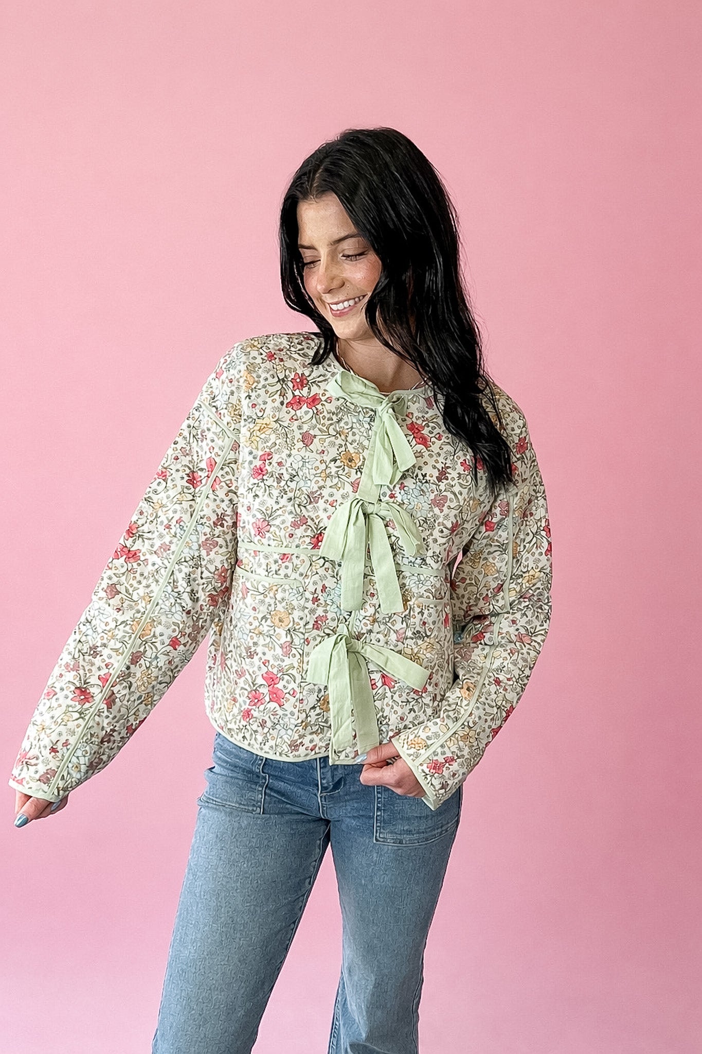 This sweet quilted jacket feels like something straight out of a spring garden. The delicate floral print paired with soft sage bow ties creates a feminine, vintage-inspired look that feels special without trying too hard. The lightweight quilted design gives it just enough structure to layer comfortably while still feeling soft and easy to wear.
