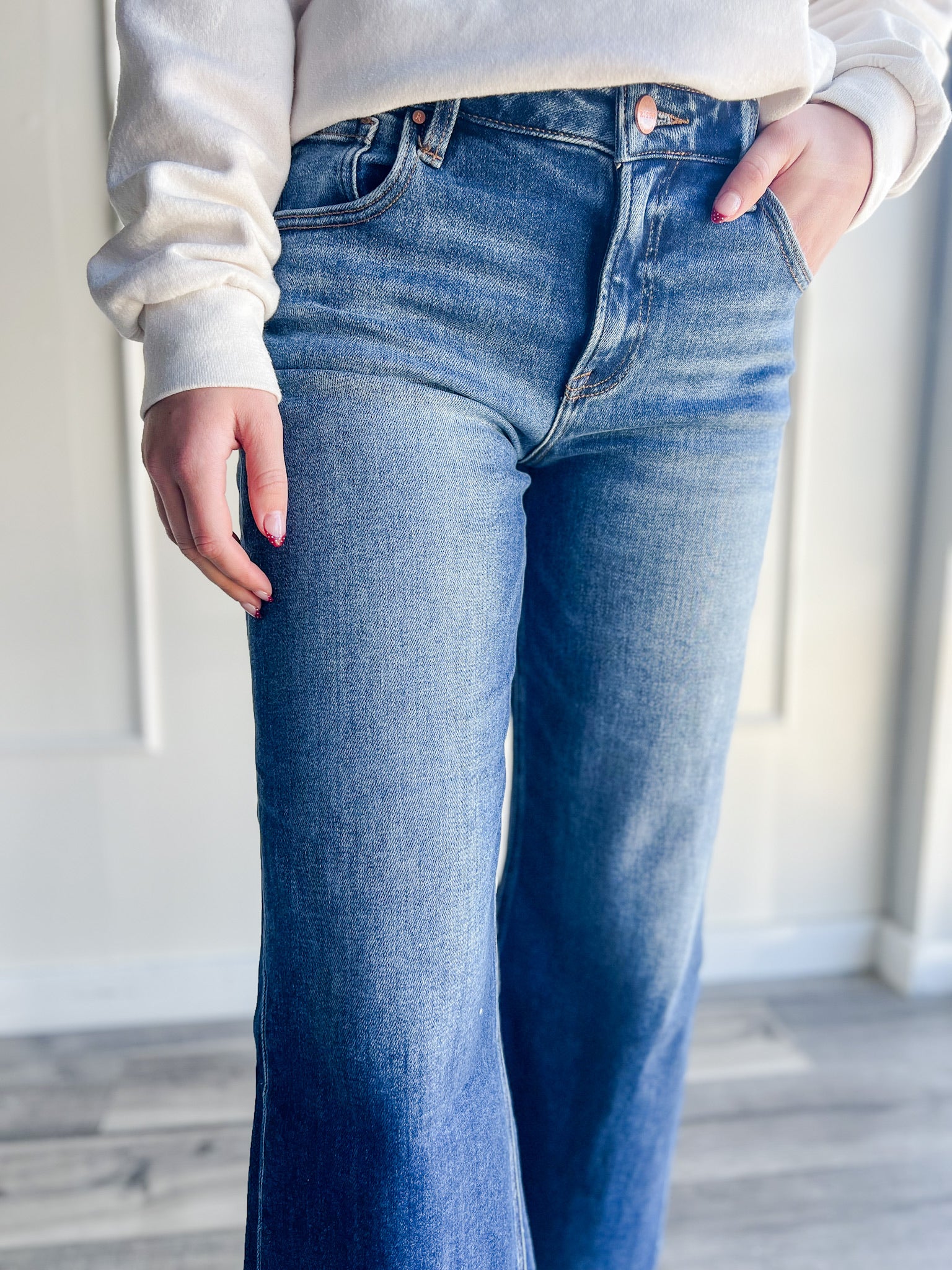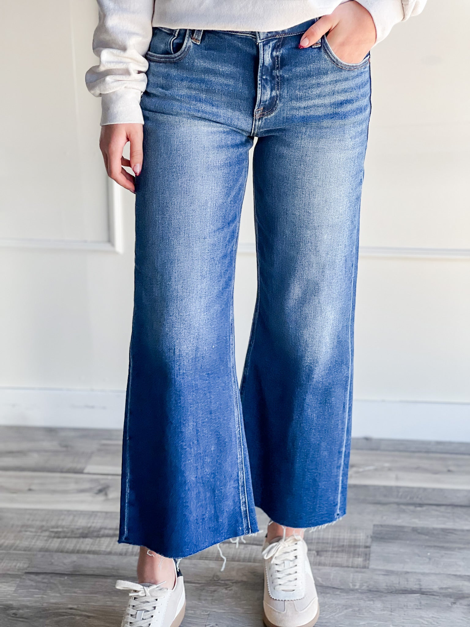 For the girl who loves a good statement jean, the Risen Raw Hem Wide Leg Denim brings effortless cool with its high-rise fit, modern crop, and subtle raw edge detail. These jeans feature a soft medium wash that pairs beautifully with everything from sneakers and sweaters to blouses and boots. The wide leg adds a relaxed yet elevated vibe, making them your new favorite for casual days or dressed-up weekends.