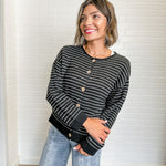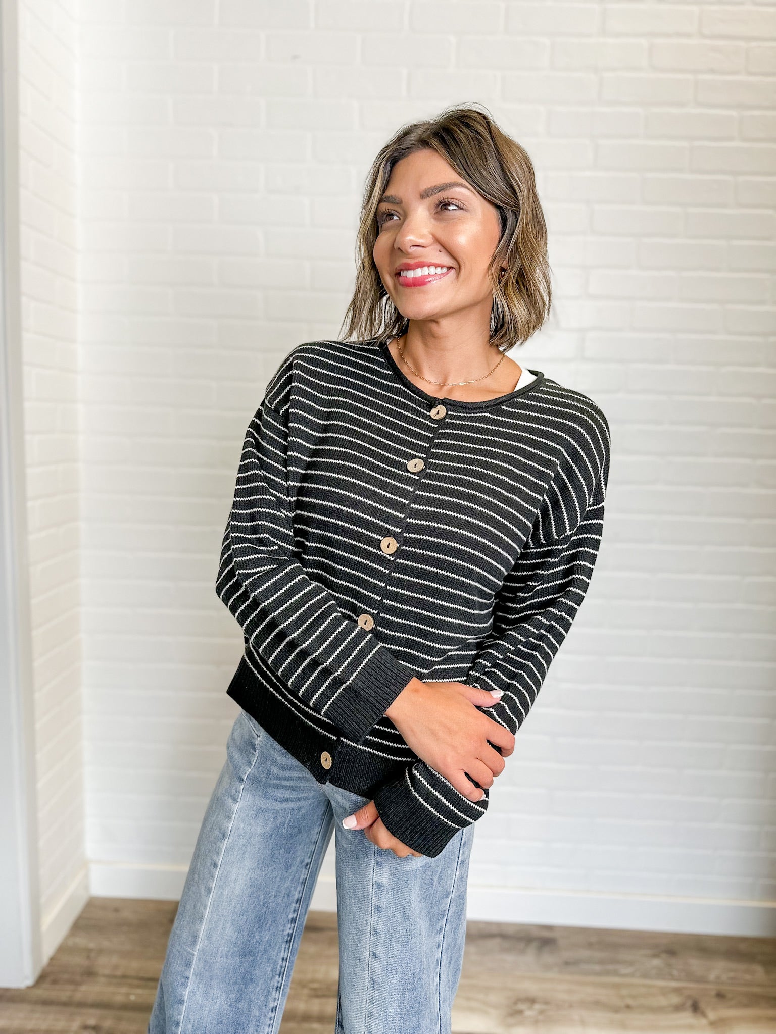 Effortless and elevated. This black-and-white striped cardigan adds just the right touch of cozy charm to your everyday look. Featuring wooden button details and a flattering fit, it’s perfect for layering or wearing on its own. Rachel is 5’2” and wearing a size small.