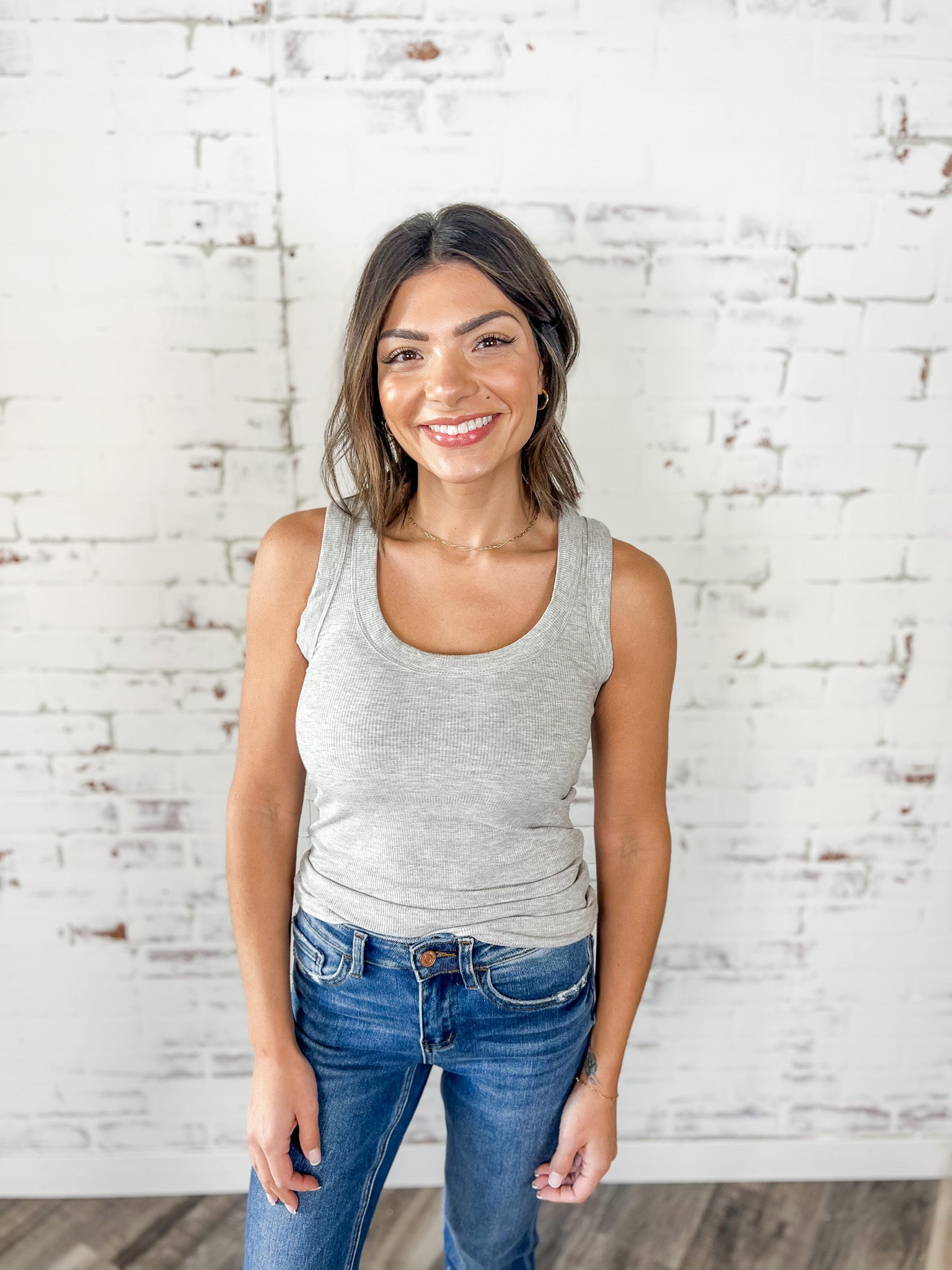 This ribbed everyday tank is one of those foundational pieces every closet needs. Made from a buttery soft, stretchy fabric, it hugs just right without feeling tight and layers effortlessly under denim jackets, cardigans and shackets. The classic scoop neckline keeps it flattering and timeless.
