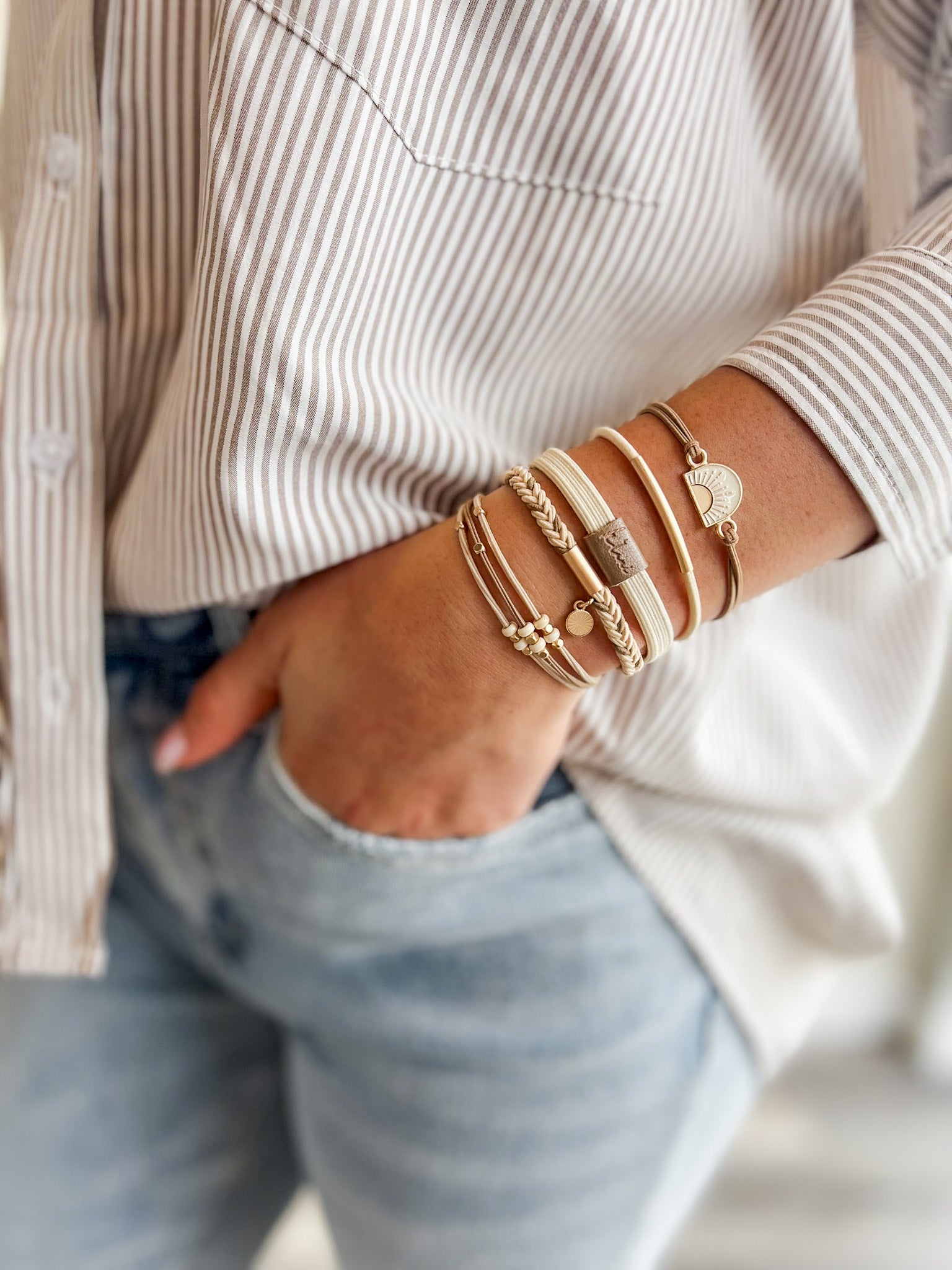 Rise and shine in style. The K’lani Rise set doubles as hair ties and stackable bracelets, giving you a chic neutral look with gold accents and sun-inspired details. Comfortable, durable, and oh-so-pretty — you’ll wear these on repeat.