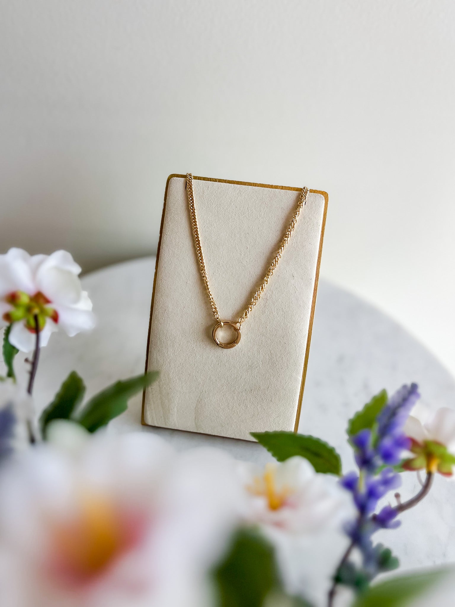 A gold tone chain necklace finished with an open circle accent at the center. Simple and balanced, this style adds a clean detail that works well worn alone or layered with other necklaces.