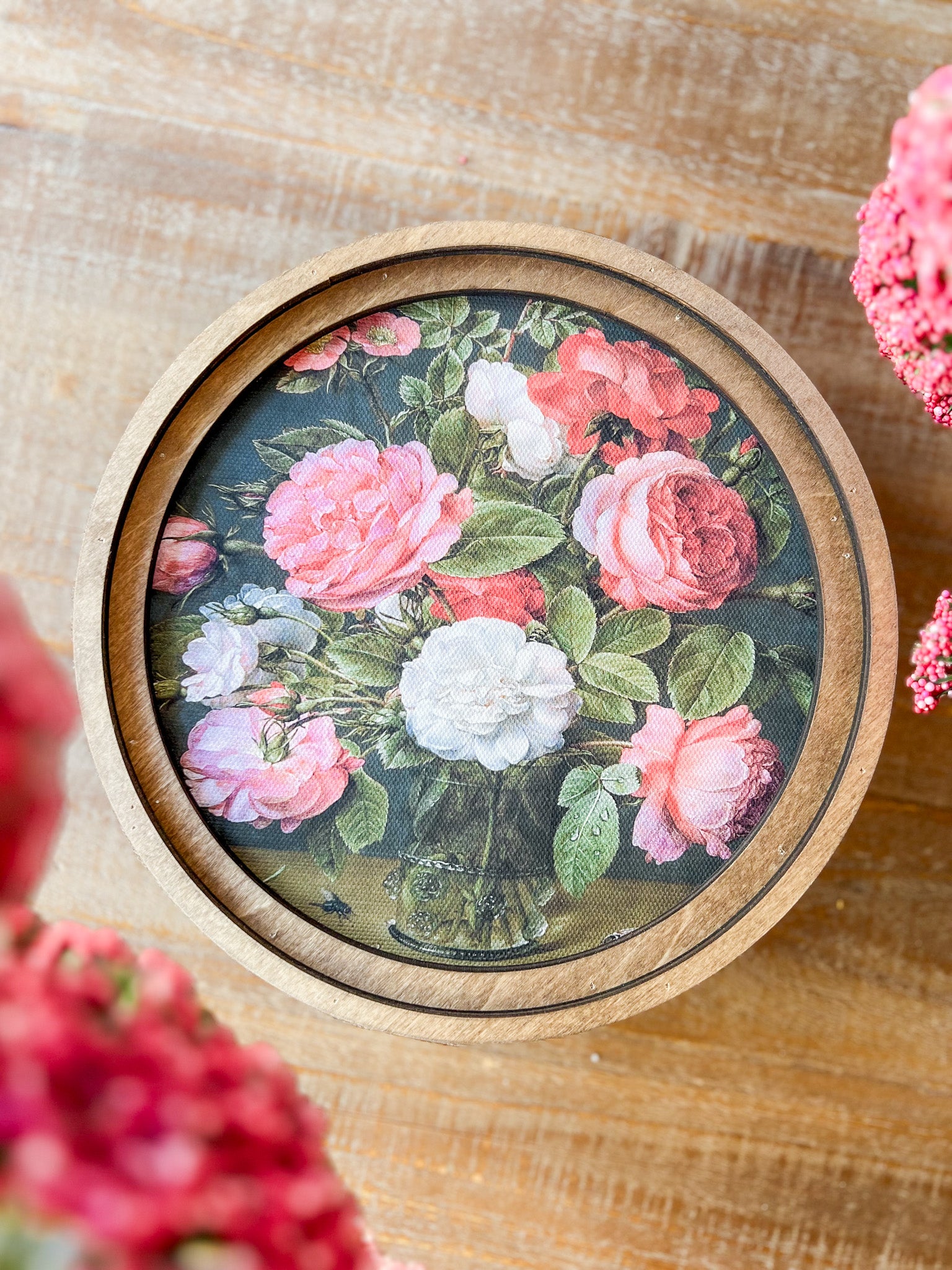 The custom frame shape gives the piece a vintage look. The artwork is printed onto canvas using beautiful Canon pigment inks. The canvas is mounted onto a wood backer. The top frame is laser cut birch wood stained in a neutral Early American tone. The entire piece is lightweight and easy to hang with an adhesive strip. (not included) You can also lean this artwork against a wall or other decor item to display it on a shelf or tabletop. It could also be displayed on an easel.