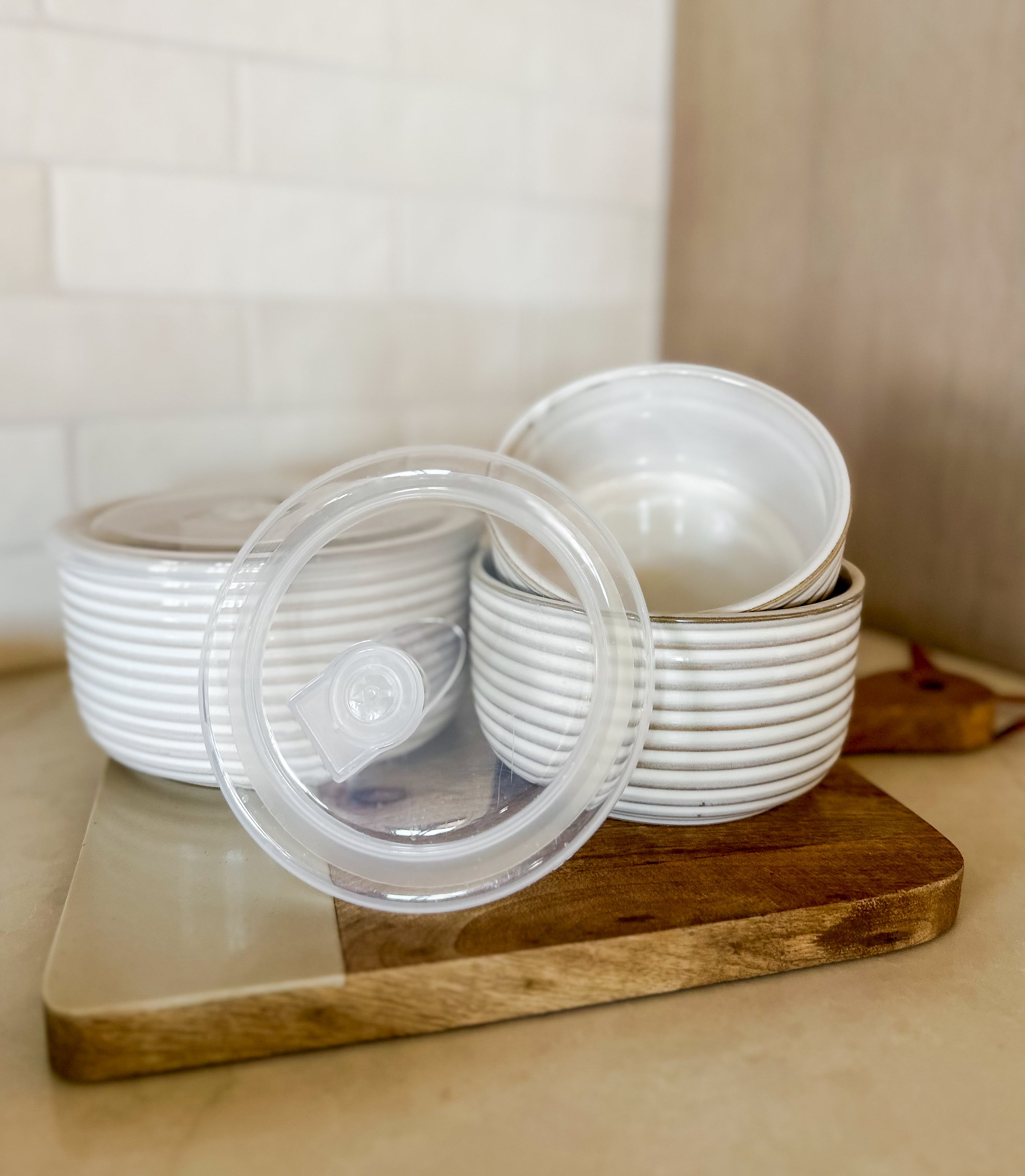 Store your leftovers in style with these Striped Storage Dishes! Made of durable ceramic, these containers feature plastic ventilated lids to keep your food fresh. The cream and brown striped design adds a touch of charm to your kitchen. Say "goodbye" to boring storage containers and "hello" to a great set to give, or receive!