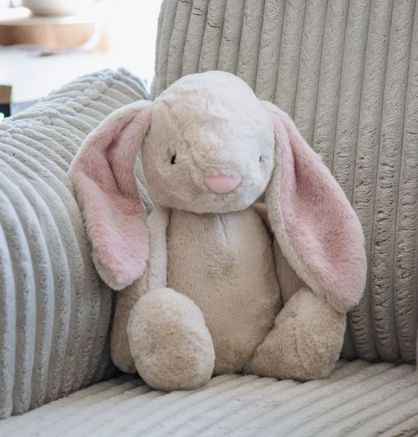 Soft, sweet and made for snuggles, this blush plush bunny is the kind of keepsake little ones will carry everywhere. With its velvety neutral body and floppy pink-lined ears, it brings a gentle touch of charm to nurseries, Easter baskets and cozy corners alike.