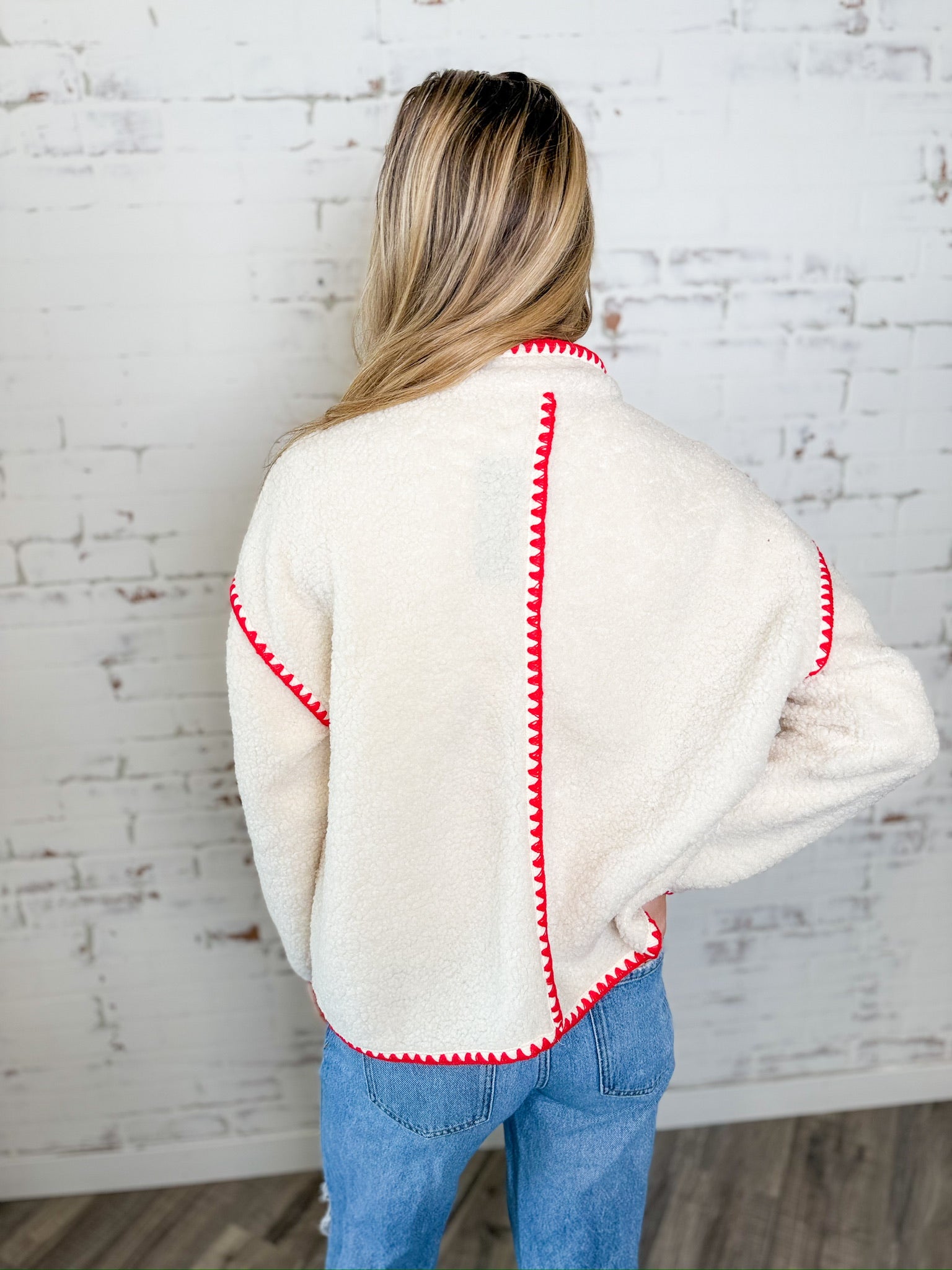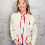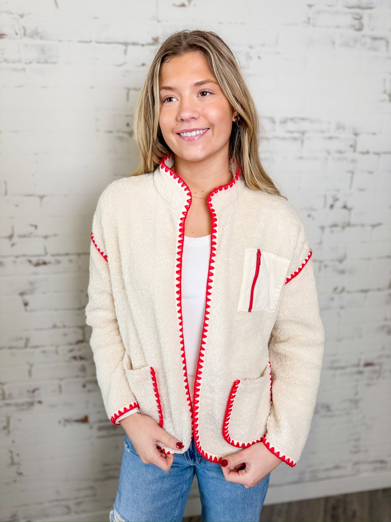 A cozy cream jacket trimmed in the cutest pop of red. Soft, textured and full of personality, this layer brings a fun twist to your everyday denim-and-tee look. The stitching detail and contrast pocket make it extra special.