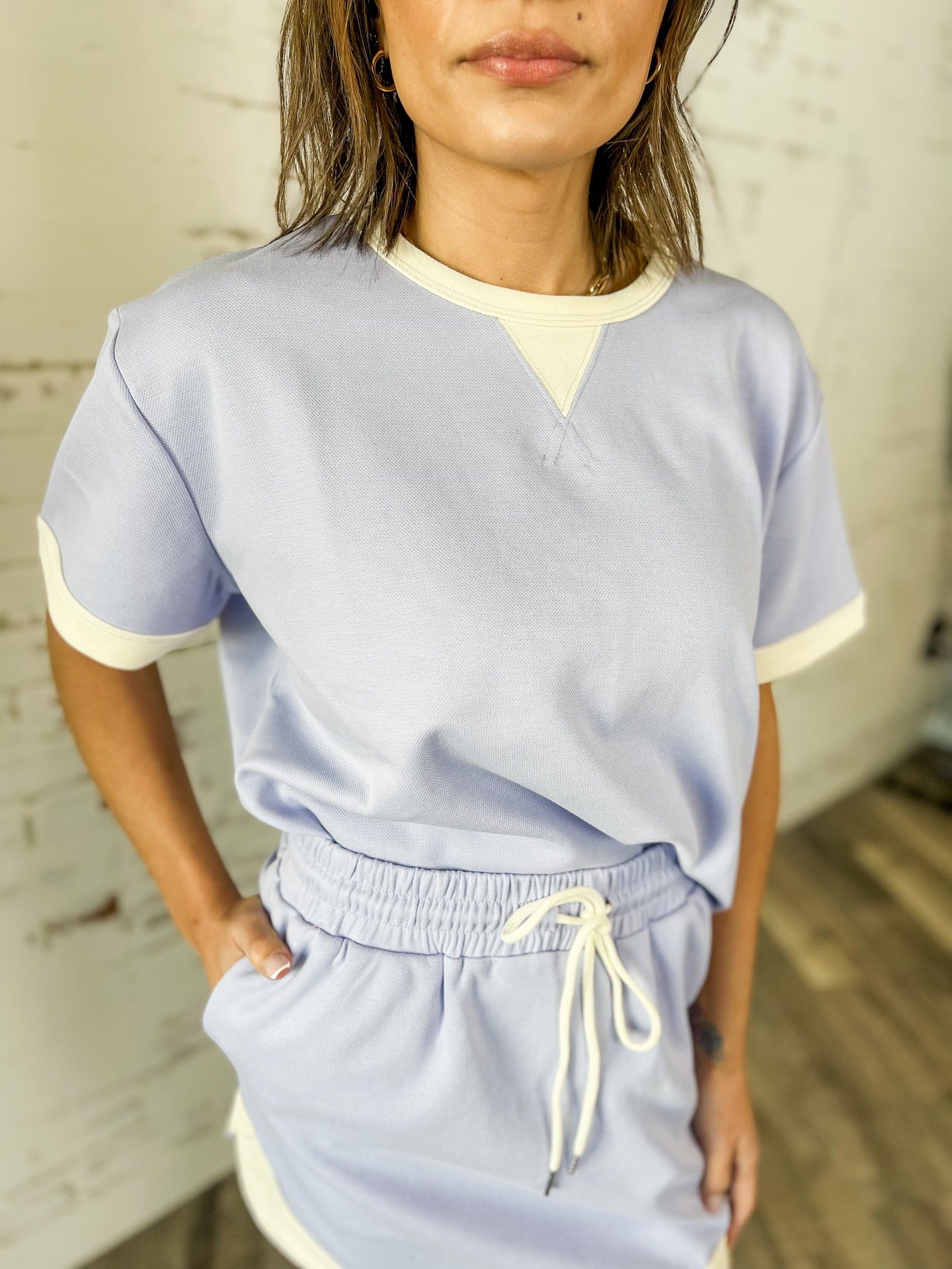 This periwinkle top is the kind of easy, throw-on piece that makes getting dressed feel effortless. With its soft cotton-blend fabric and relaxed fit, it’s comfortable enough for all-day wear while still looking polished and put together. The contrast trim adds a sporty touch that pairs perfectly with casual bottoms.