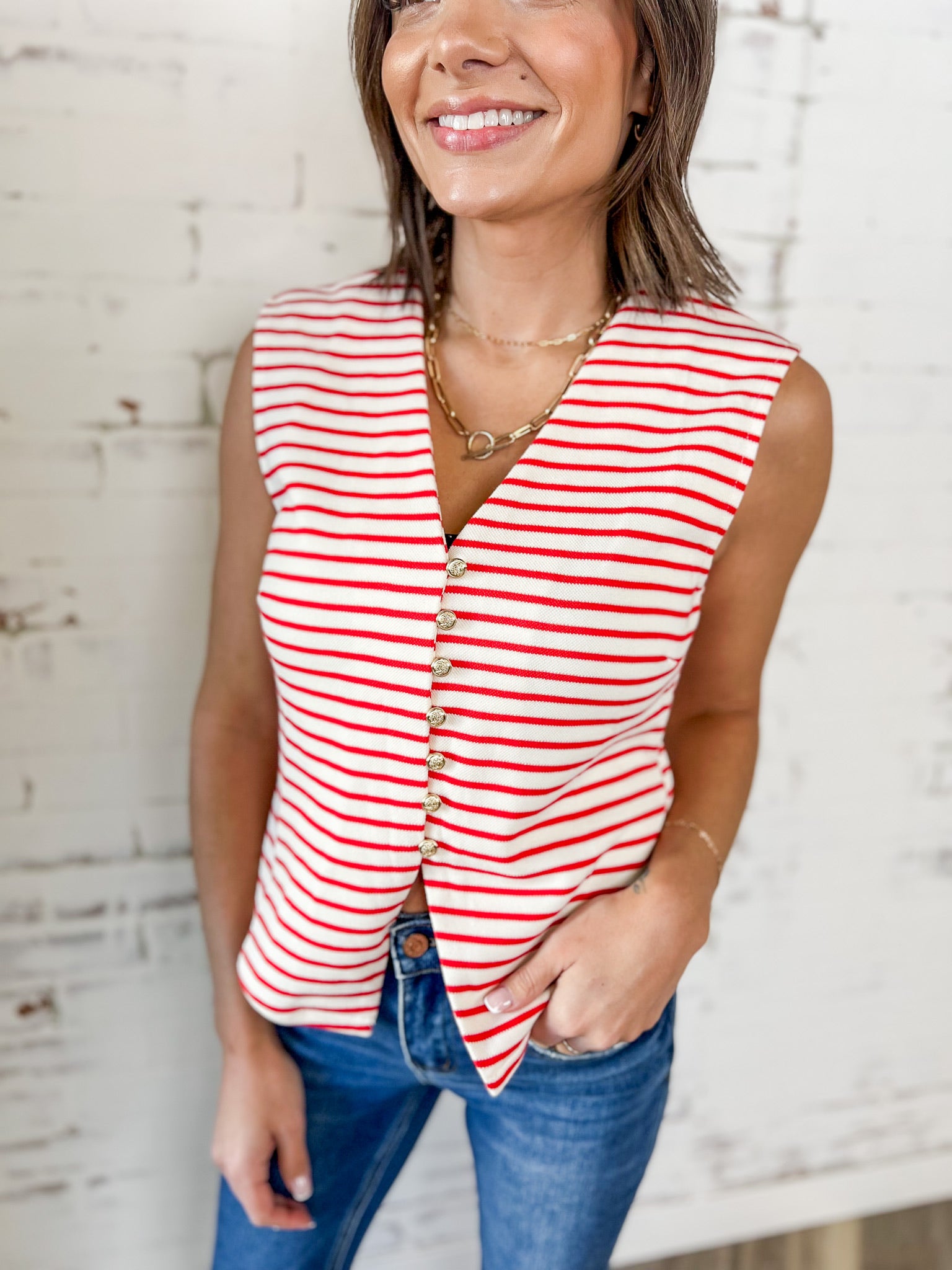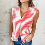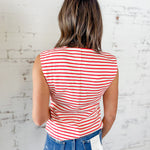 This striped knit top brings just the right mix of playful and polished. The Sunset Stripe Button Front Knit Top features a flattering sleeveless silhouette with a v-neckline and chic button front detail that instantly elevates a classic stripe.