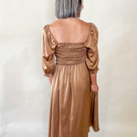 Chic, sleek, and perfect for fall—this satin-style midi dress is made to turn heads. The smocked bodice and flowy skirt keep it flattering, while the rich copper shade makes it unforgettable.