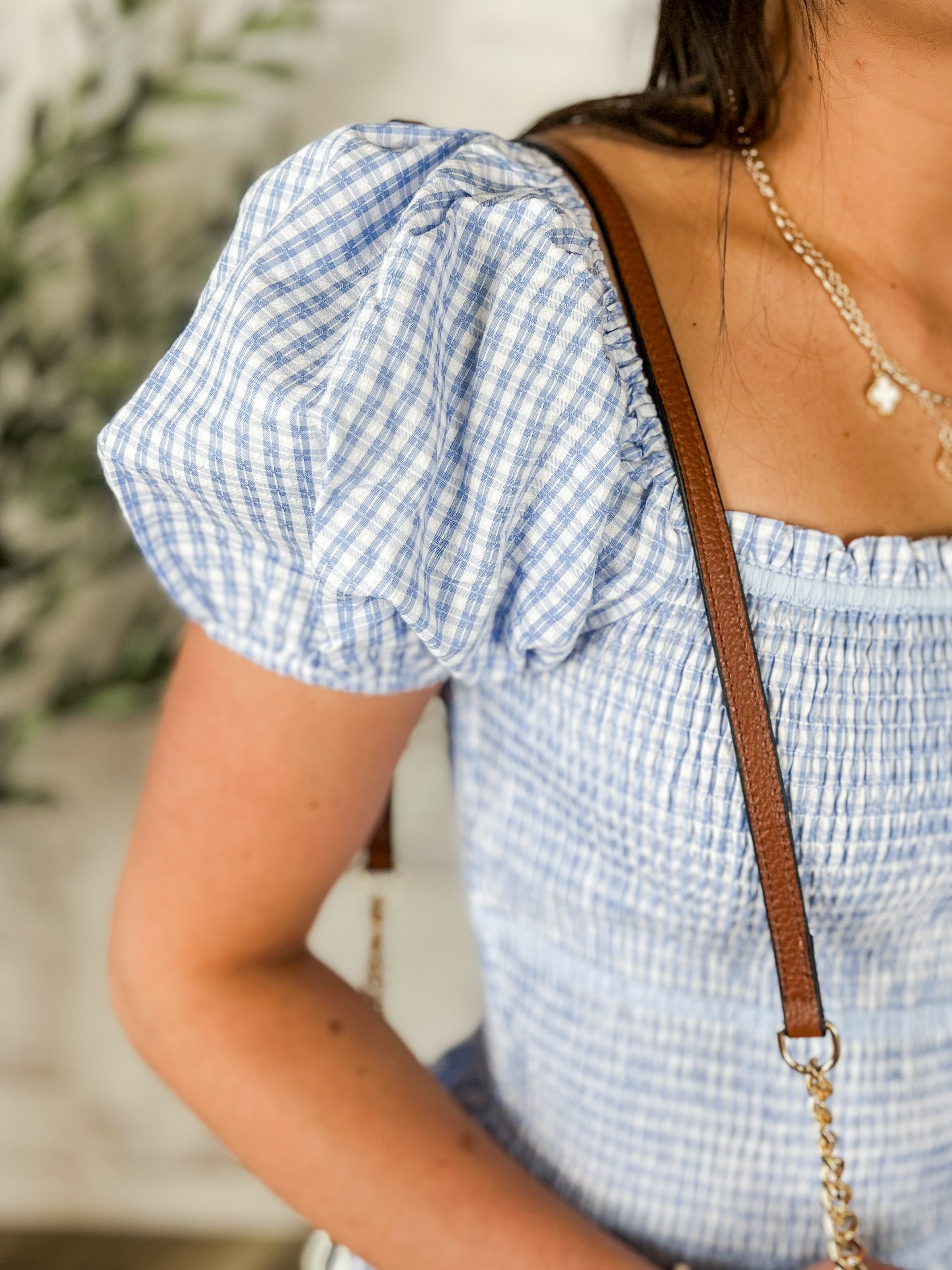 If sunshine were an outfit, it would be this romper. The Smocked Gingham Romper is all about charm and comfort with its smocked bodice, puff sleeves, and soft blue-and-white gingham pattern that screams “summer sweetheart.”