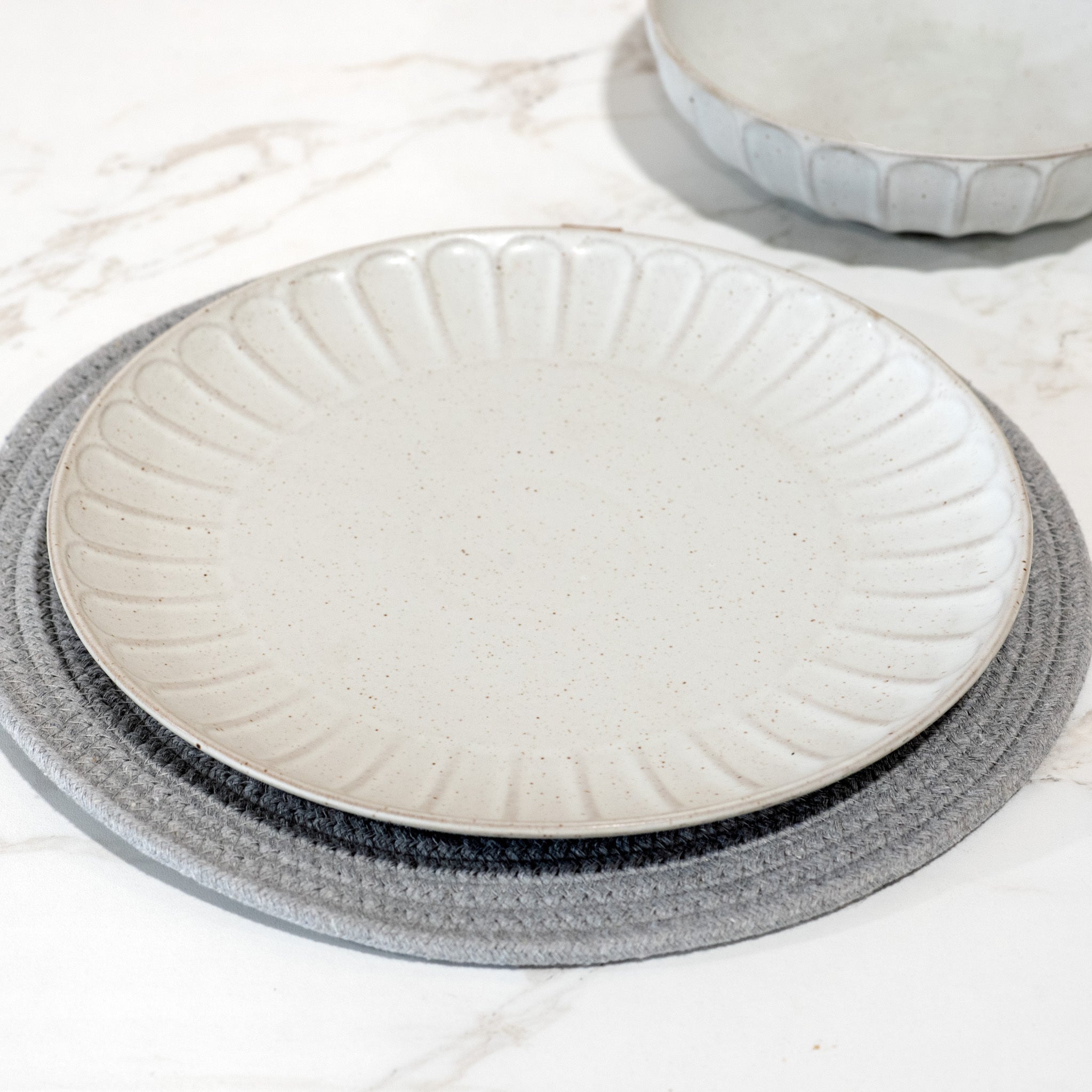 This 11" stoneware plate features a distinctive speckle design and a thumbprint side detail for a unique touch. The perfect size for full meals, this plate combines style and functionality to elevate your dining experience.