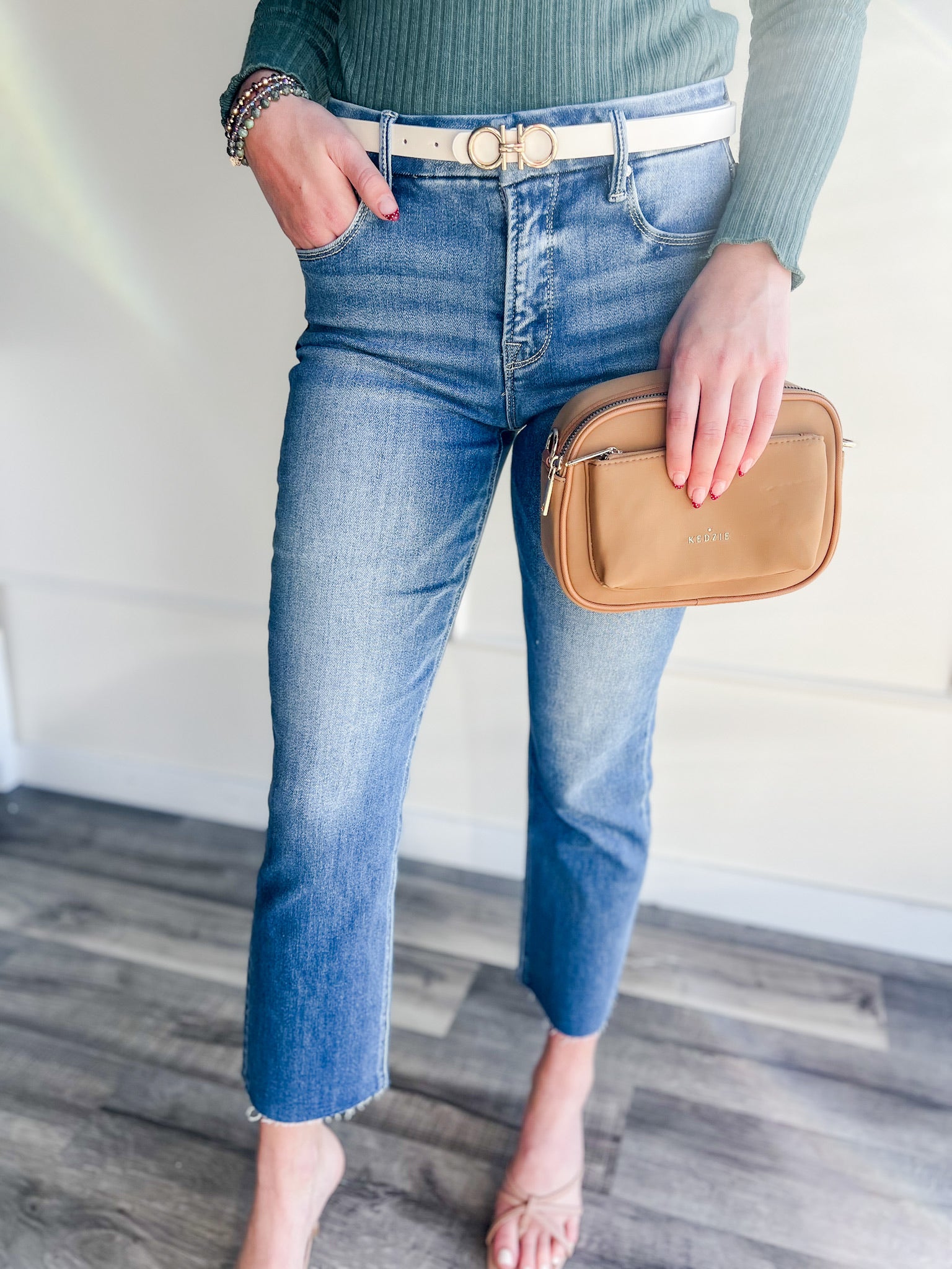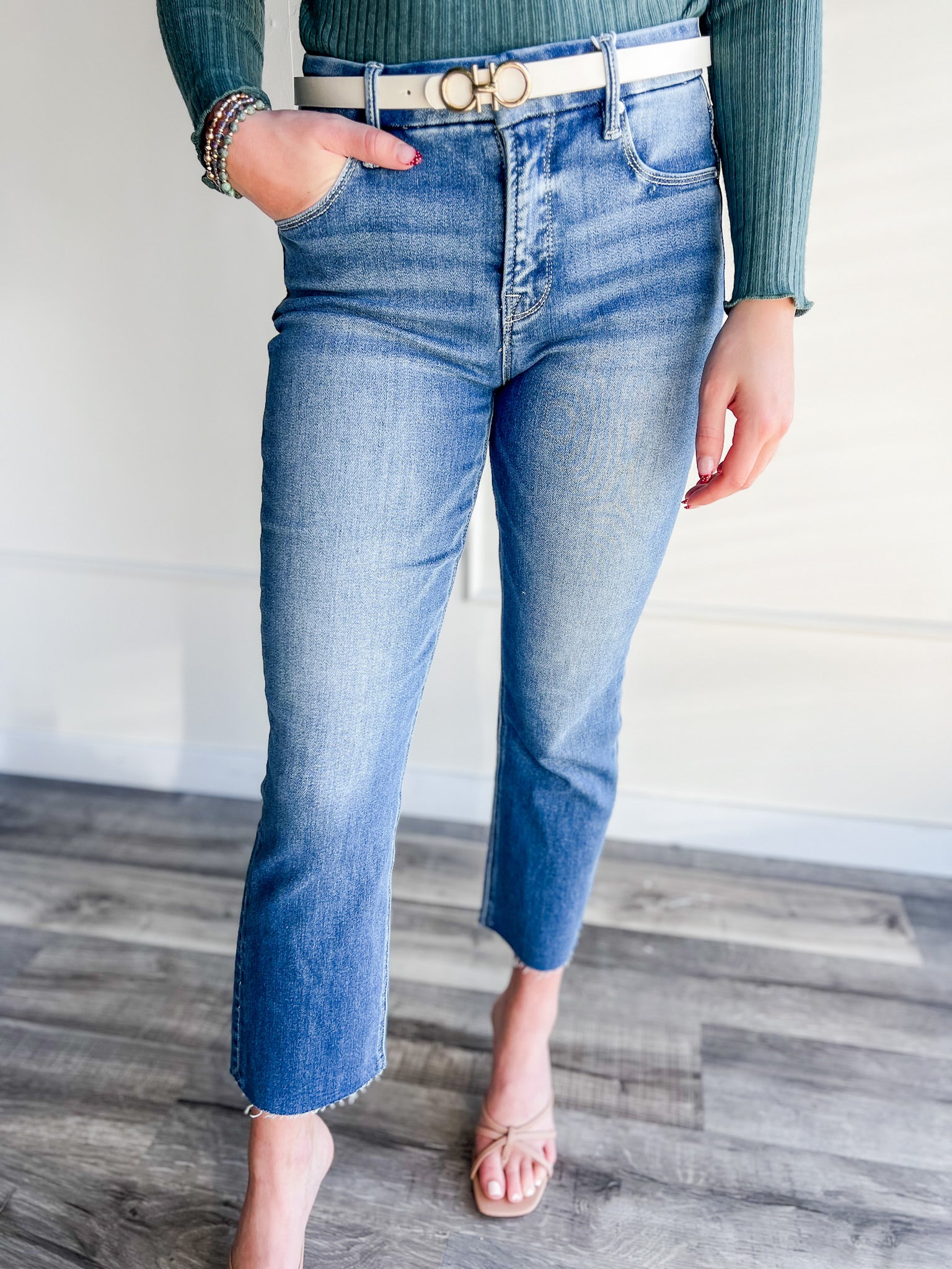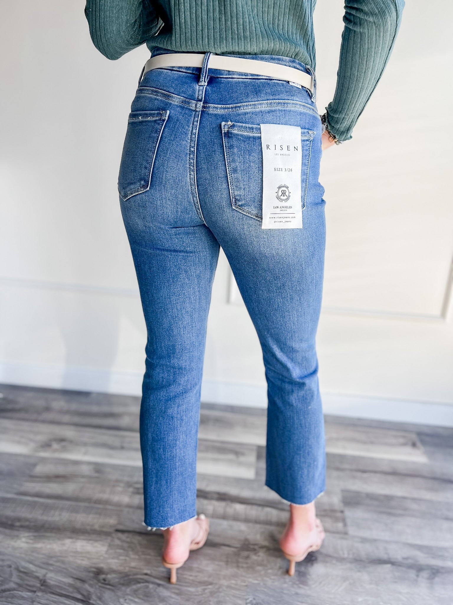 Say hello to your new favorite jeans — the pair that flatters every shape, works with every shoe, and makes you feel instantly put together. The Risen Cropped Straight Denim features a modern ankle-length cut with a clean hem and classic medium wash that goes from casual coffee runs to dressy date nights in seconds. The subtle stretch makes them as comfy as they are cute, perfect for busy days that don’t stop.