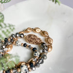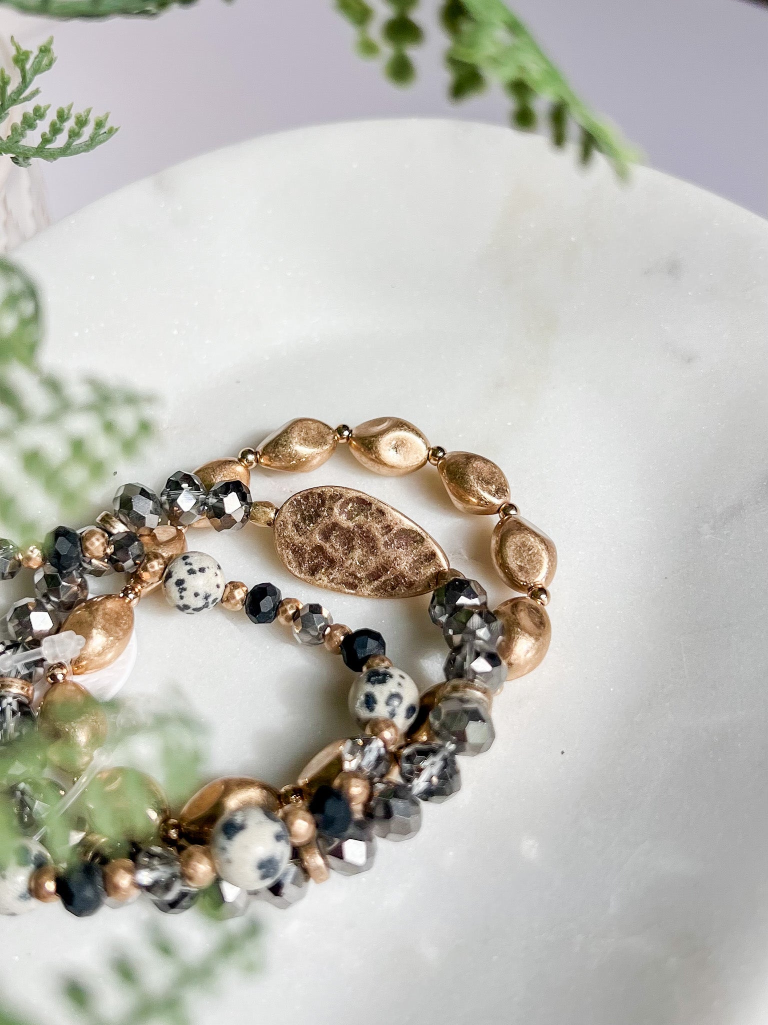 Matte gold, faceted black, and Dalmatian jasper-style beads create a bold, modern mix. The perfect balance of edgy and refined — stack all or wear one for a touch of texture.