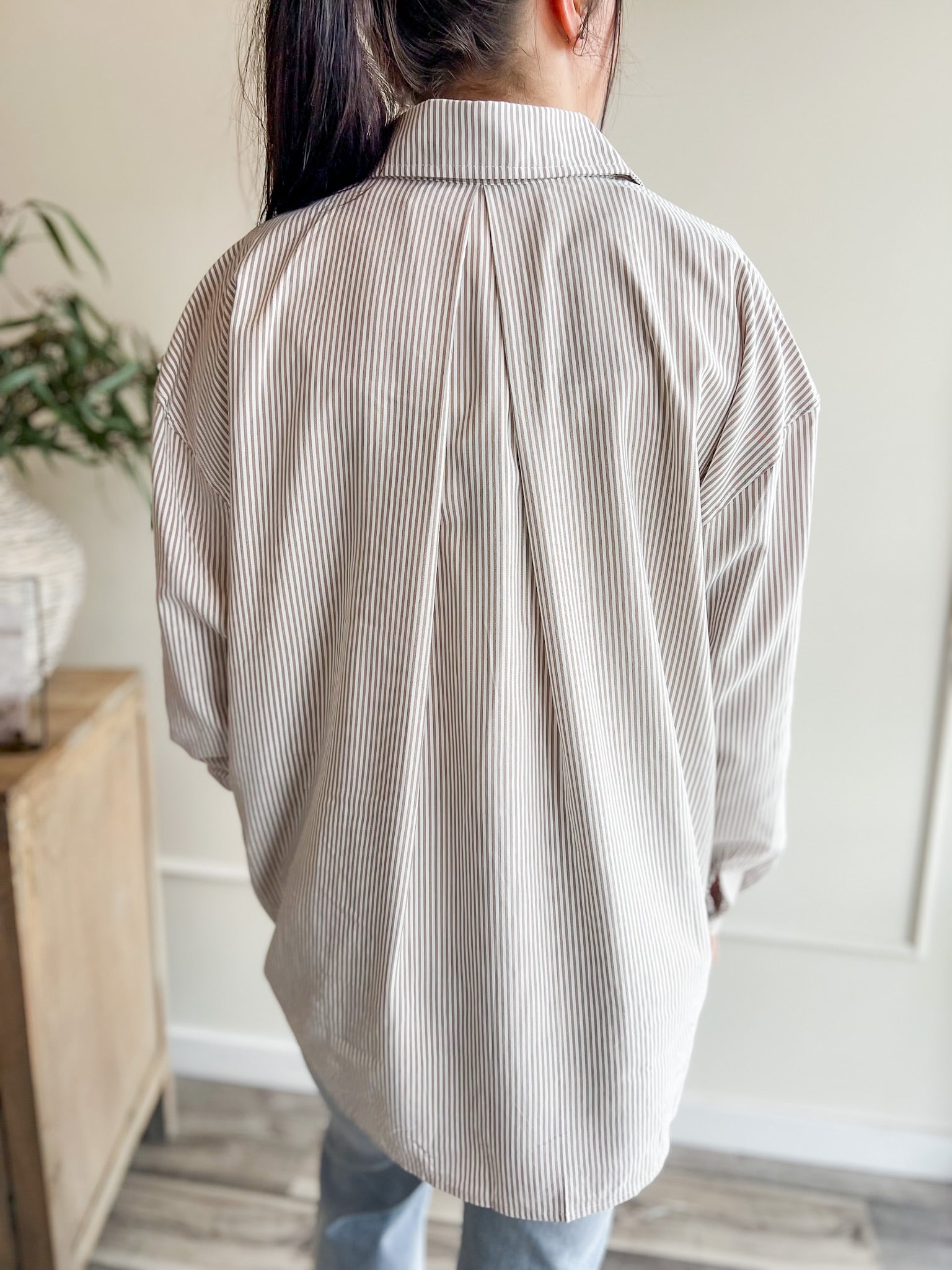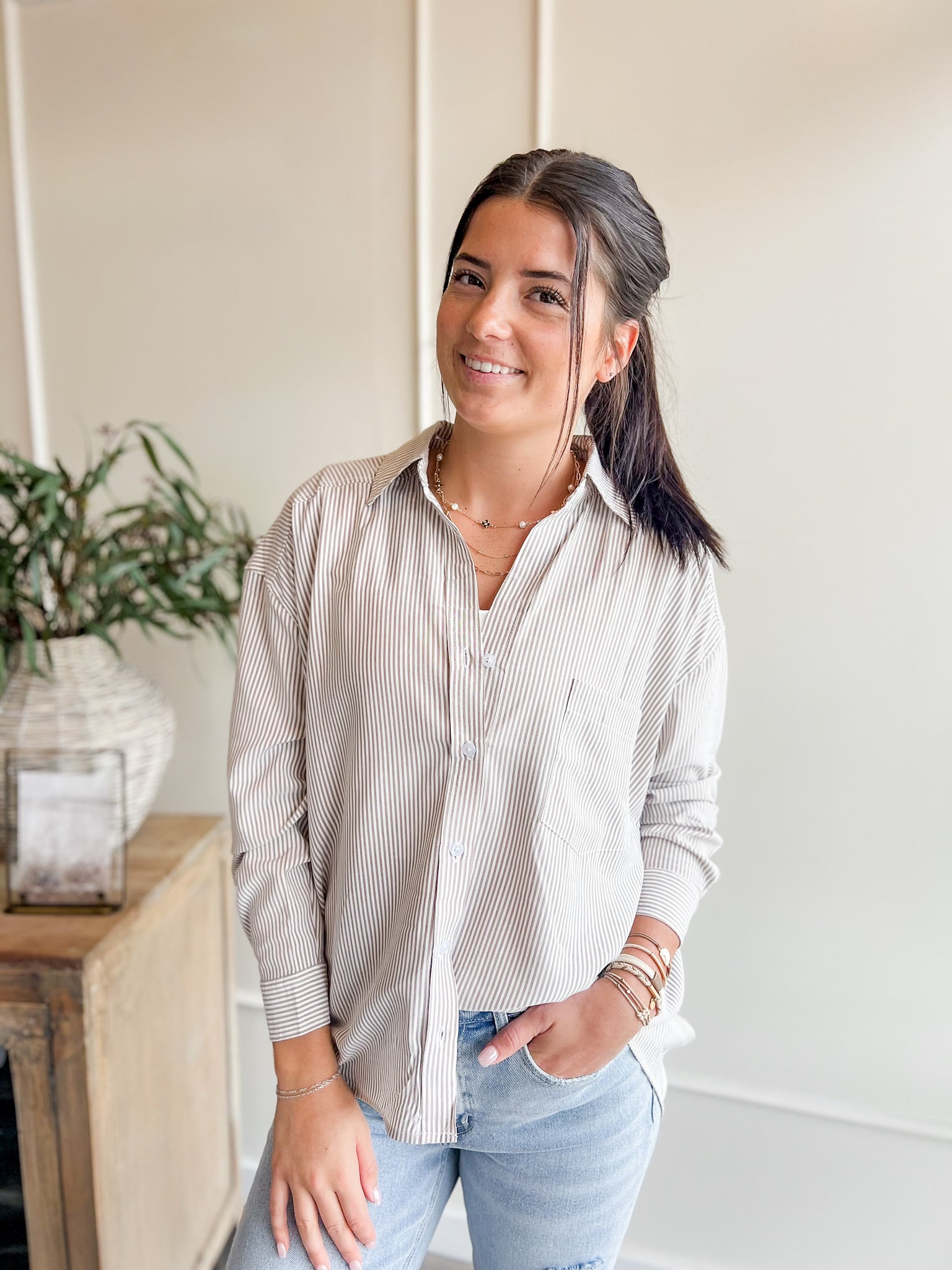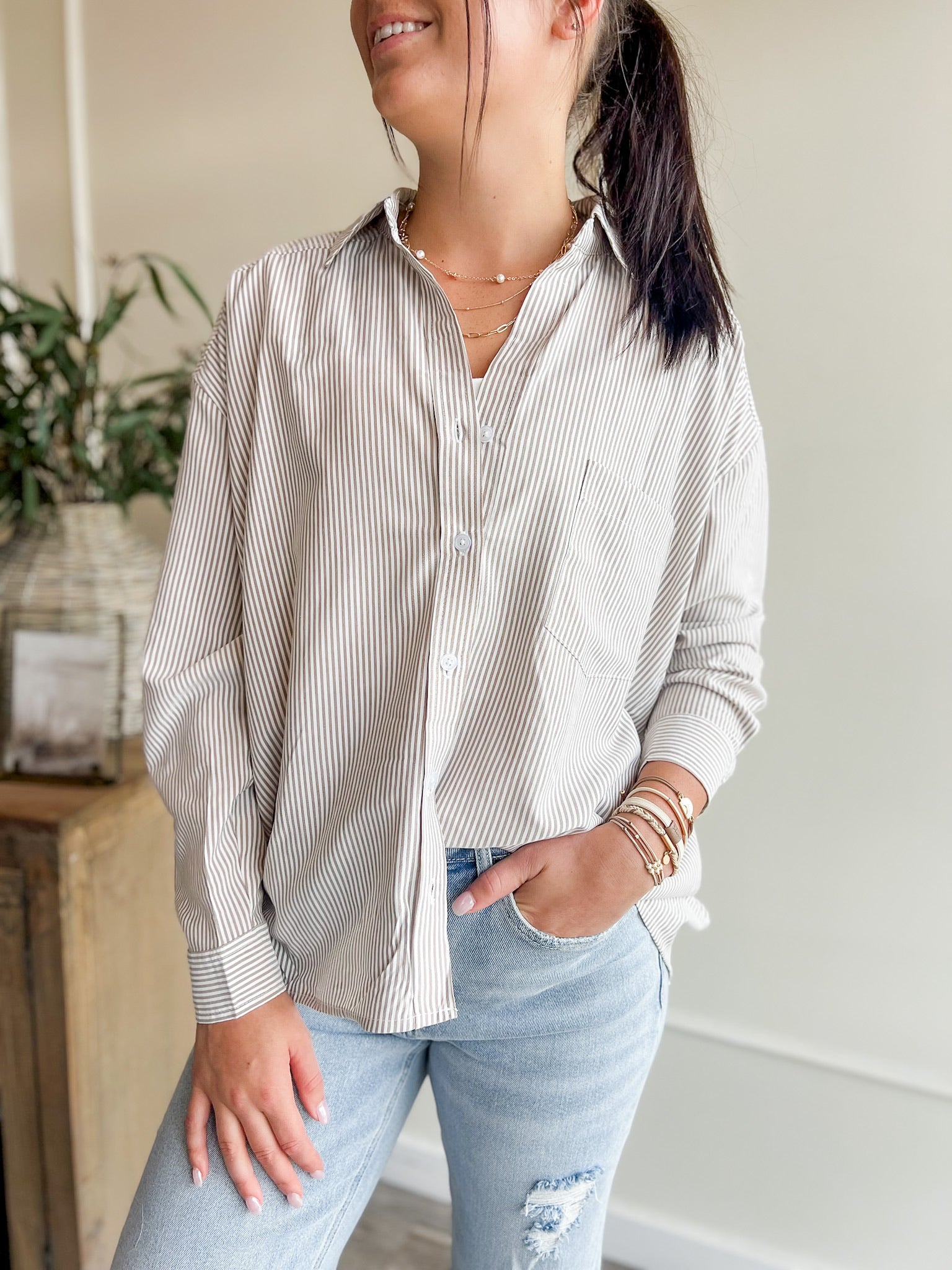 Classic never goes out of style. The Pinstripe Perfection Button Down brings an easy, timeless vibe with its relaxed fit, lightweight fabric, and subtle neutral stripes. Whether you’re tucking it into denim, layering it open over a tank, or giving it a front knot, this button-down is as versatile as your calendar is full.