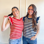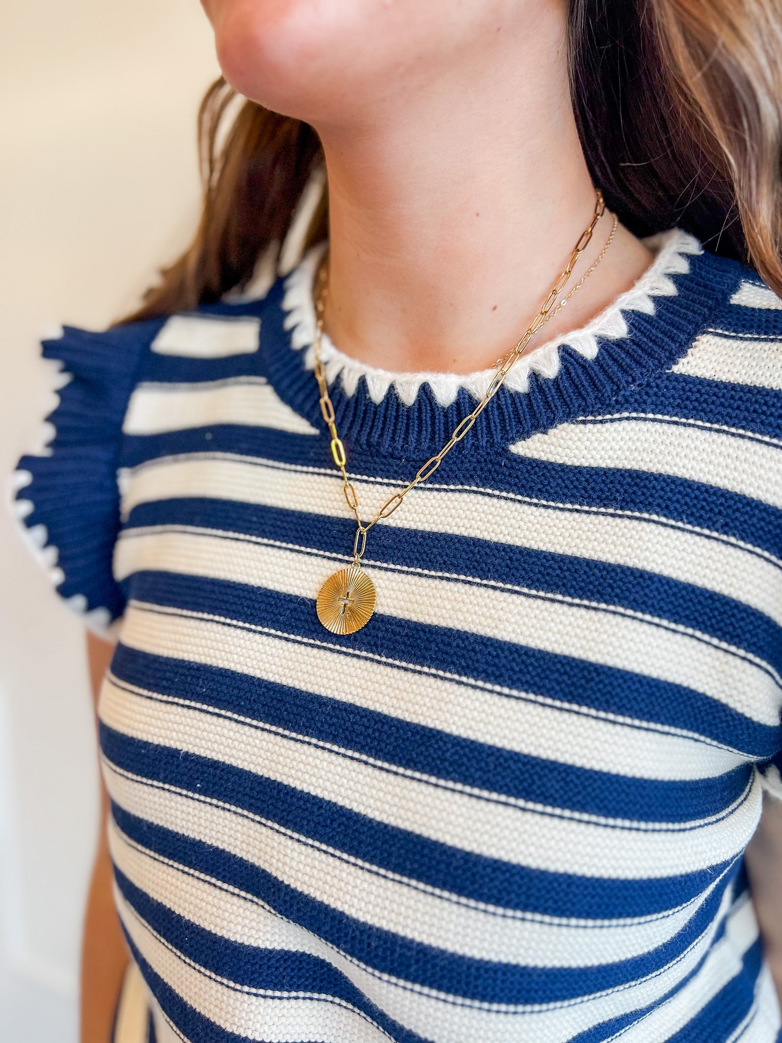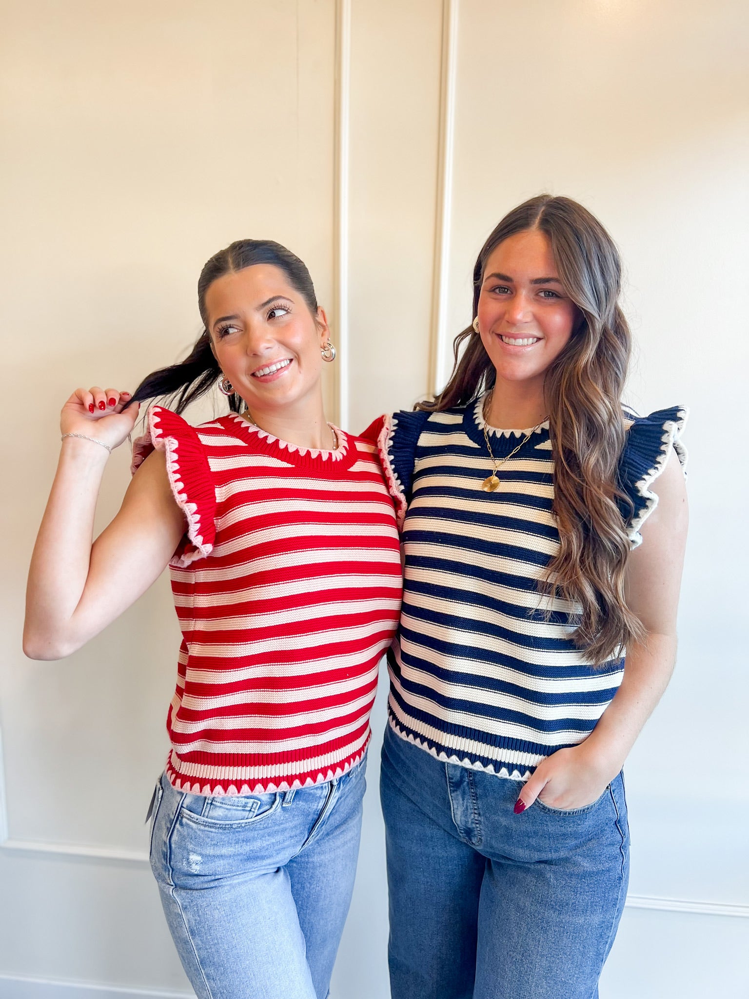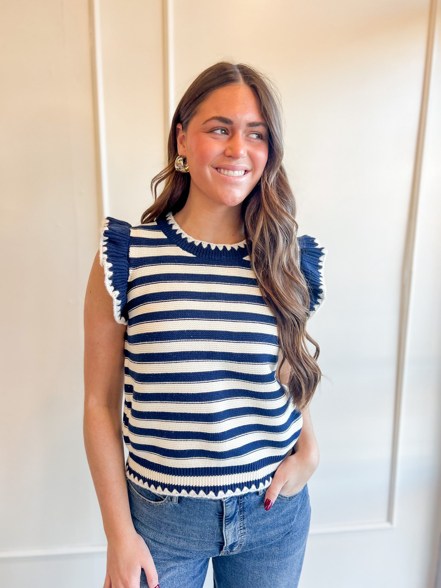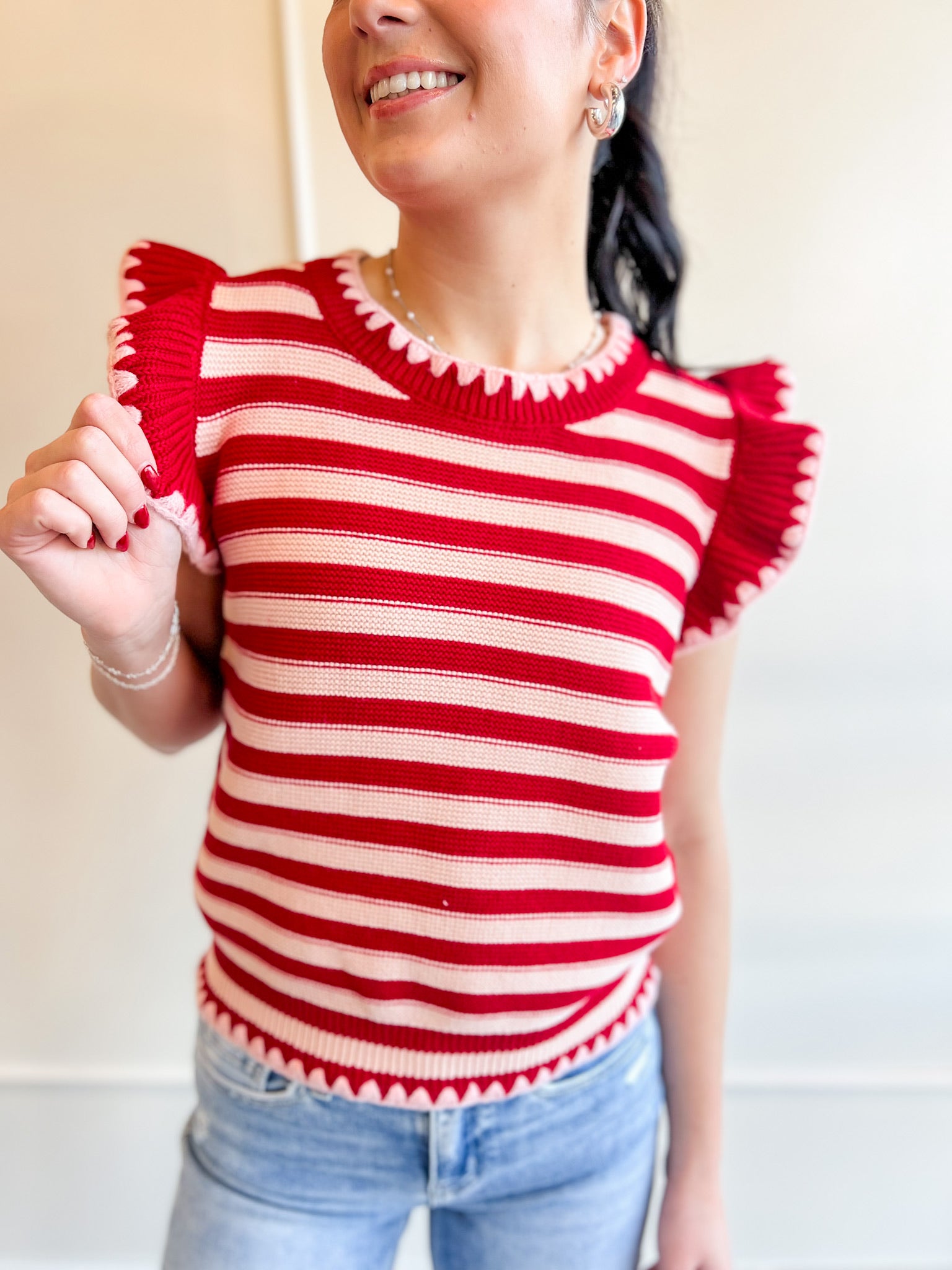 This striped sweater top is the perfect blend of playful and polished. The flutter sleeve detail adds a soft, feminine touch while the knit feel keeps it comfortable and easy to wear. It’s one of those pieces that stands on its own with minimal styling — just add your favorite denim and you’re good to go.