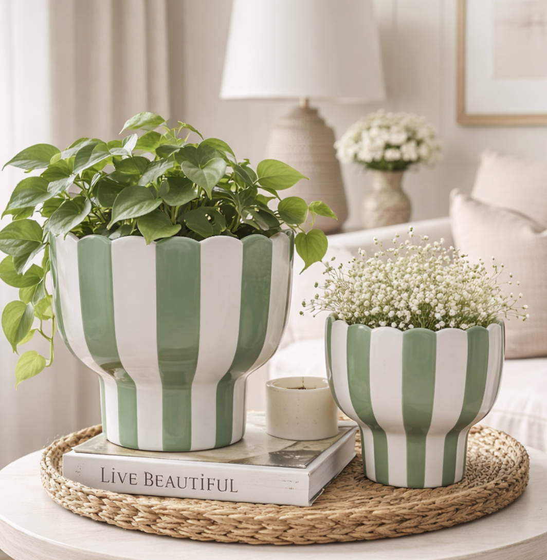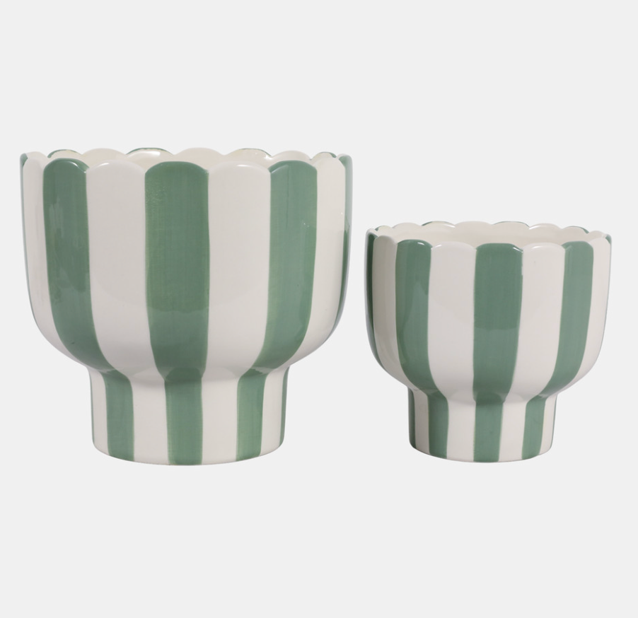 Add a fresh pop of pattern to your space with this green and white stripe planter. The scalloped edge and vertical stripe design bring just the right amount of charm to shelves, tabletops or covered patios.