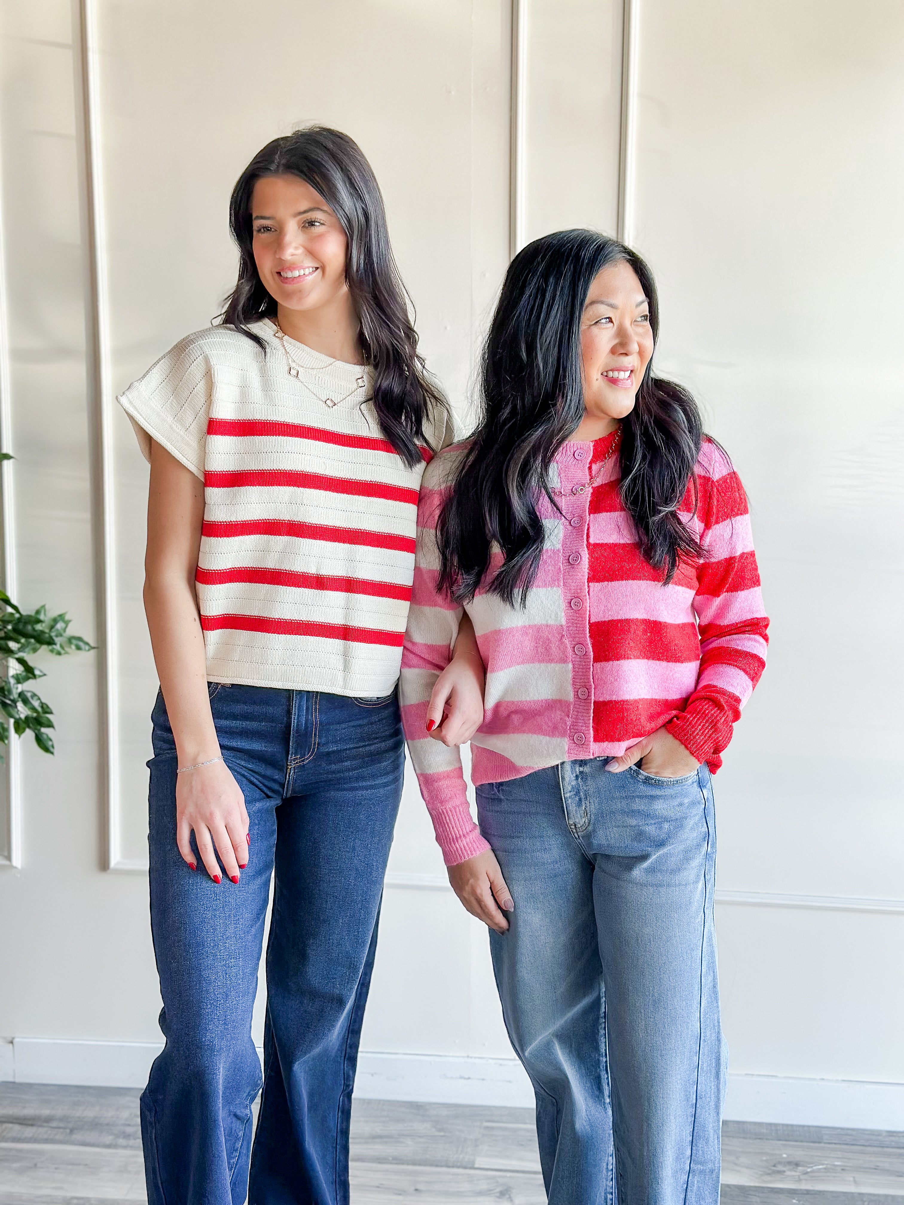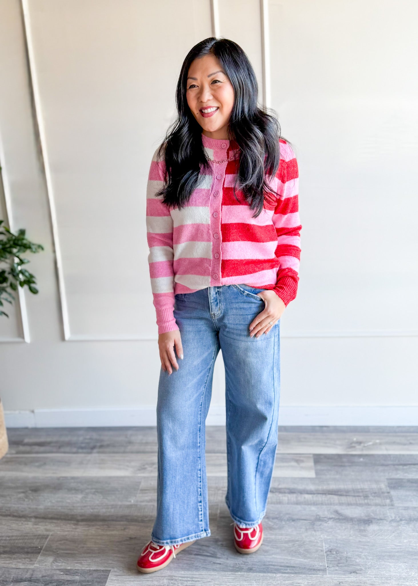 Soft, cheerful and just the right amount of playful, this striped cardigan is one of those throw-on-and-go pieces that instantly brightens your day. With a cozy knit feel and classic button-front design, it’s perfect for school drop-offs, coffee dates or casual days at the shop. The pink and red stripe combo adds a fun pop of color while still feeling easy and wearable for everyday life.