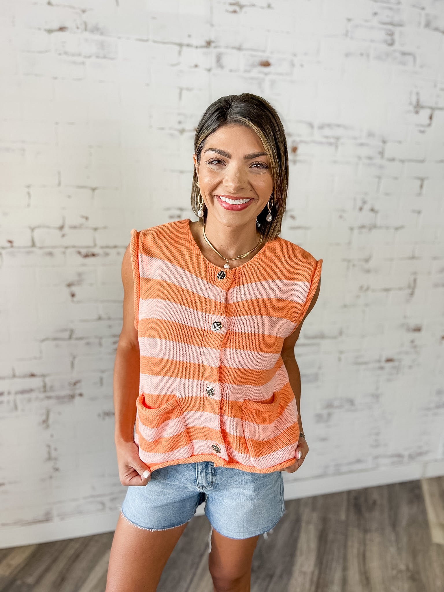 Bright, playful and full of personality, the Sunset Stripe Knit Vest is the kind of piece that instantly adds energy to your outfit. The cheerful striped pattern paired with the soft knit texture gives it that relaxed, laid-back feel while still looking thoughtfully styled.