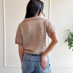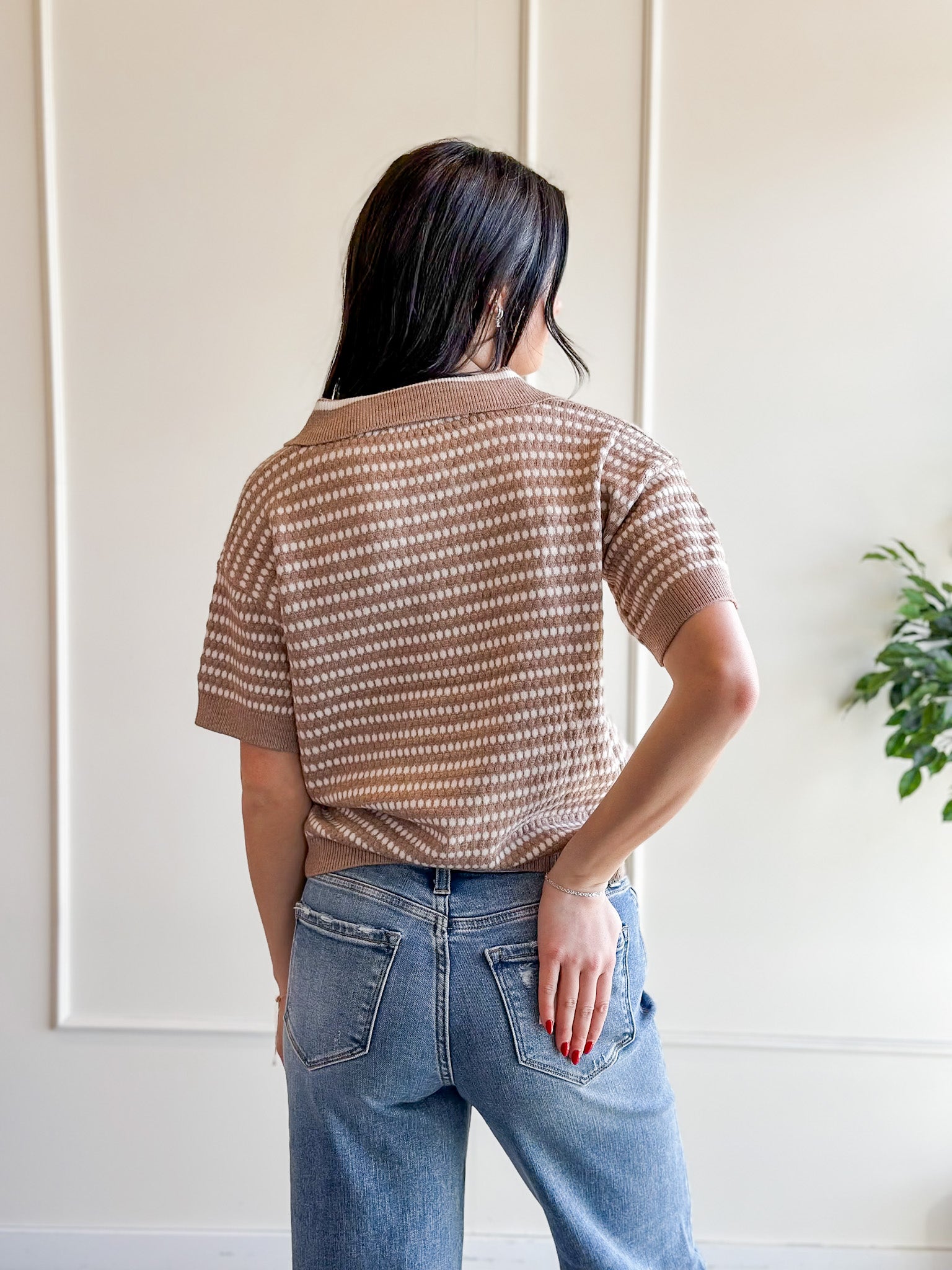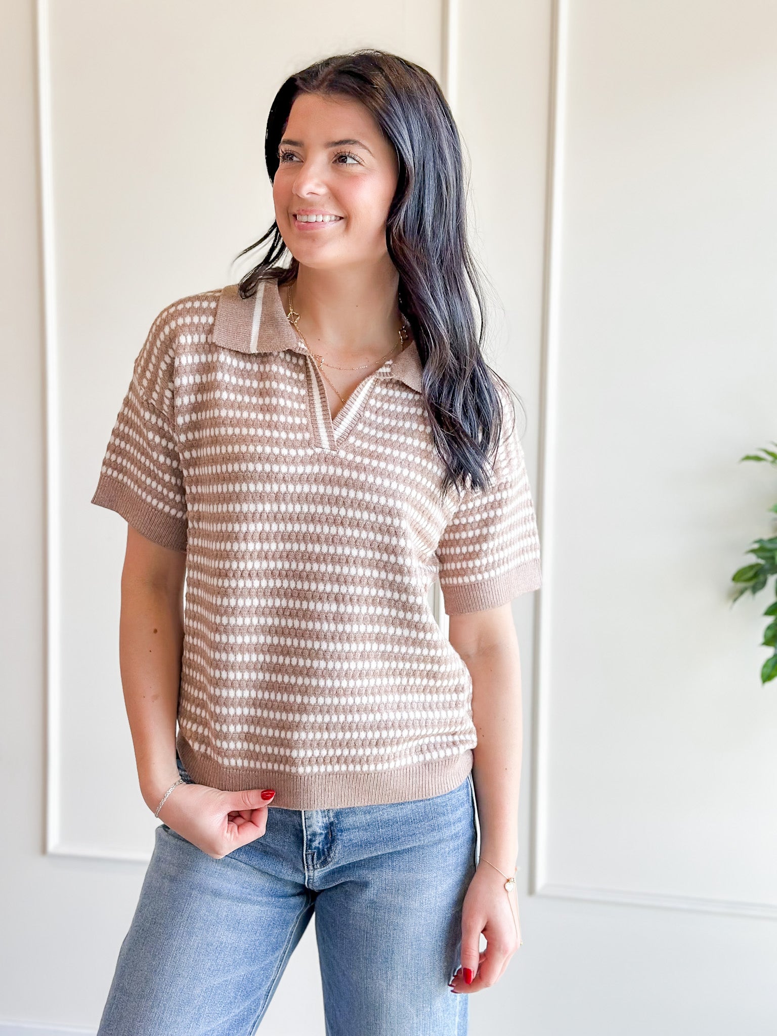 This neutral knit polo top features a soft textured stripe pattern and an easy collared neckline that feels polished without being fussy. Lightweight and comfortable, it’s perfect for everyday wear and easy to dress up or down.