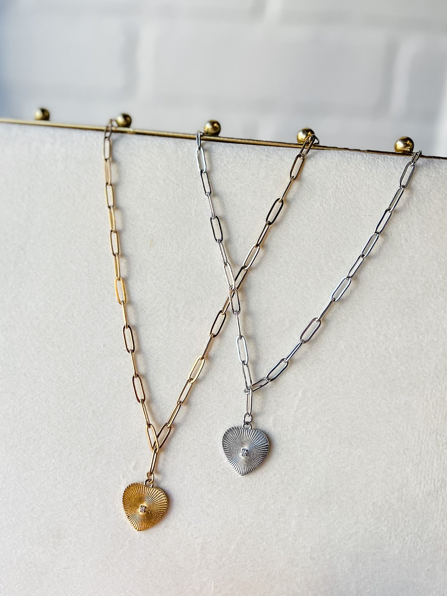 This linked chain necklace features a textured heart charm that adds just the right amount of detail. Easy to wear on its own or layered with your everyday favorites, it’s a timeless piece you’ll reach for again and again.