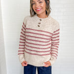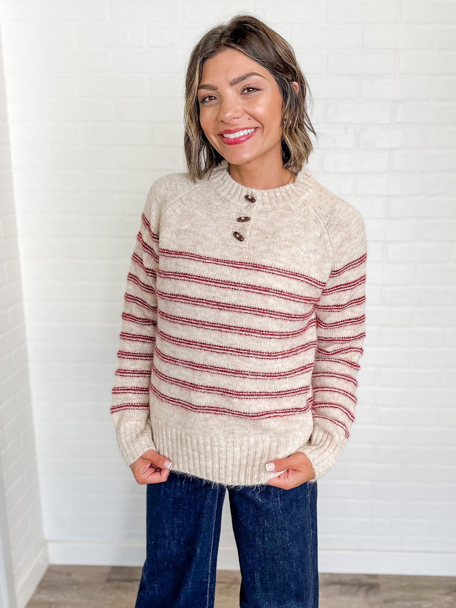Cozy with a classic twist. This cream knit sweater features soft burgundy stripes and button detailing at the neckline — perfectly casual yet put-together. Ideal for cool days, coffee runs, and everything in between. Rachel is 5’2” and wearing a size small.