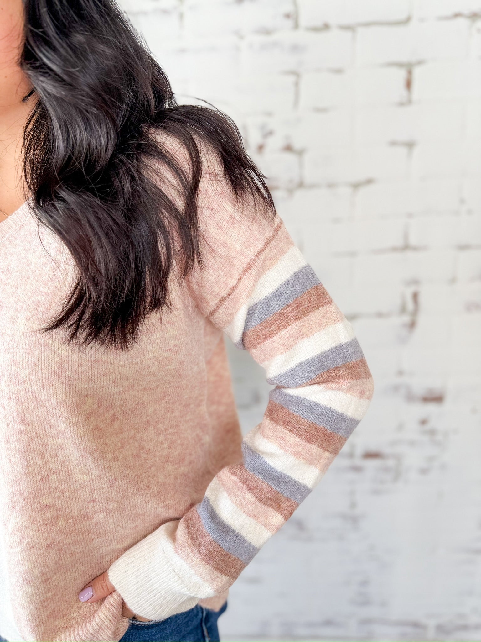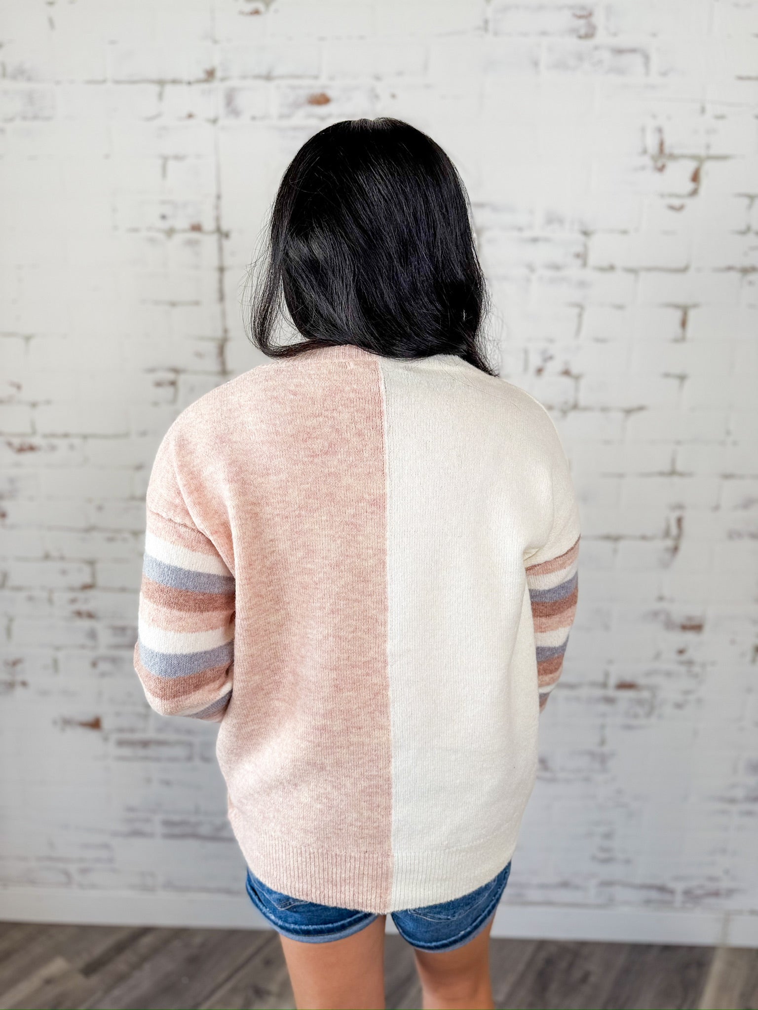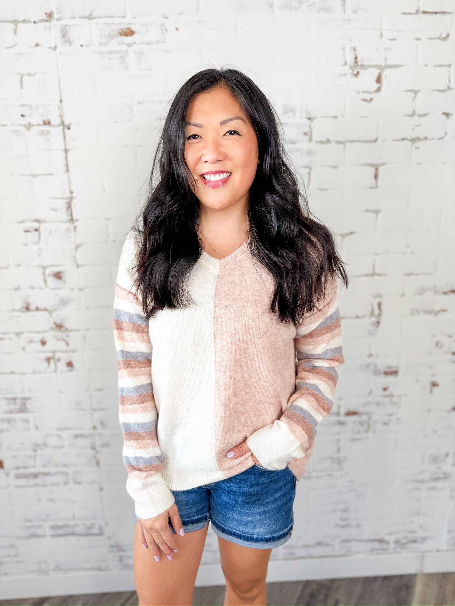 Soft, playful, and full of personality—this colorblock sweater is the ultimate cozy-chic layer. With a mix of stripes and solids, it adds just the right amount of fun to your everyday look.