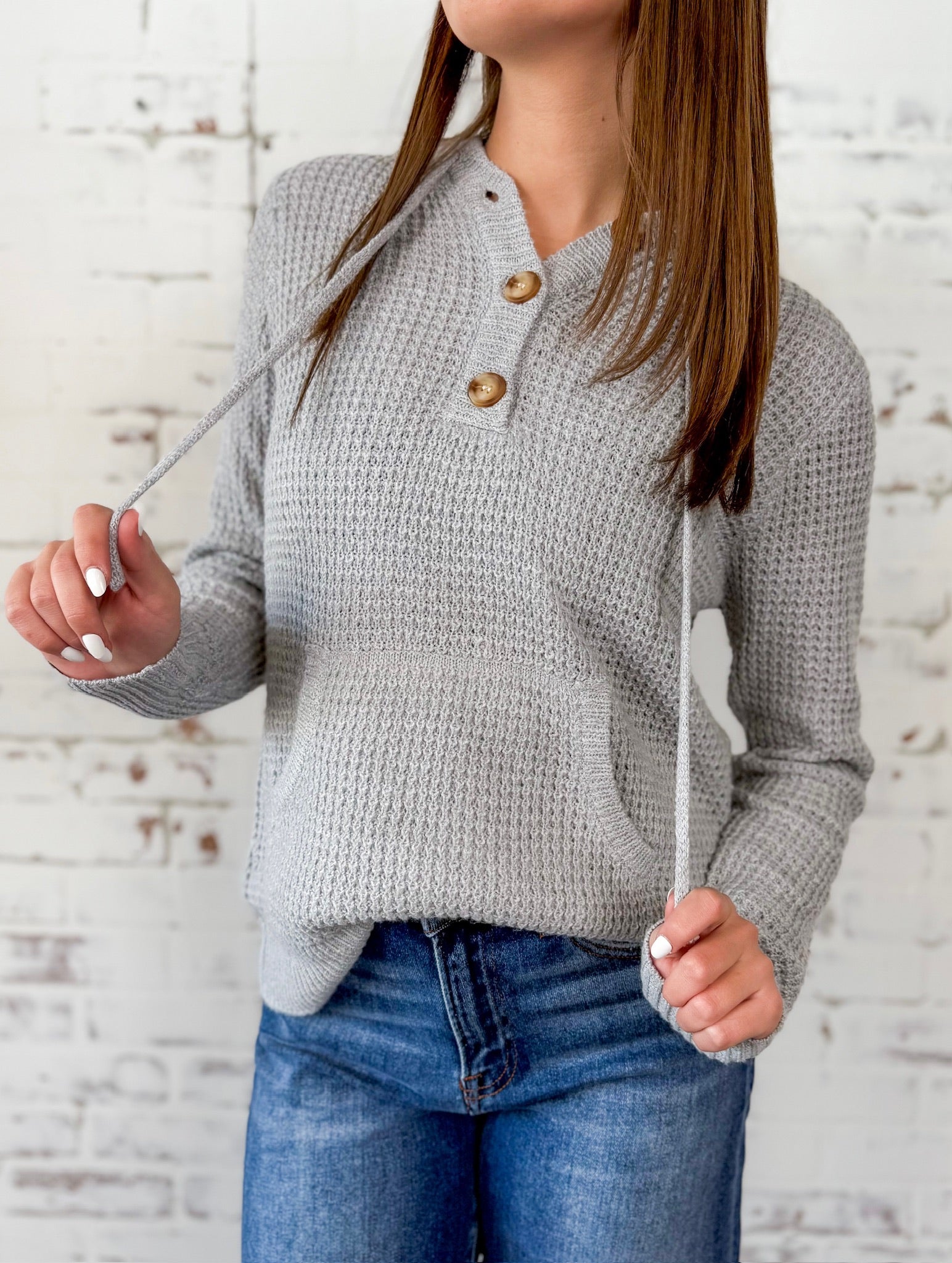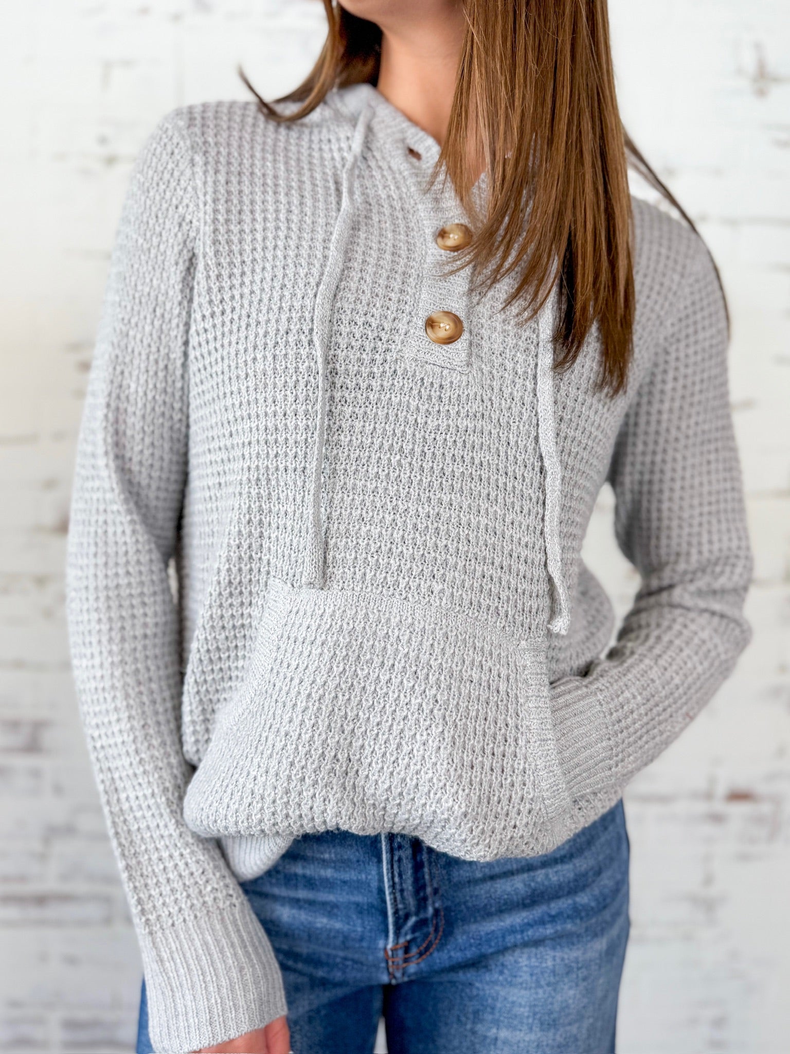 Soft, slouchy, and so easy to love—this waffle knit hoodie is the perfect throw-on-and-go layer. Wooden buttons and a kangaroo pocket keep it casual yet cute.