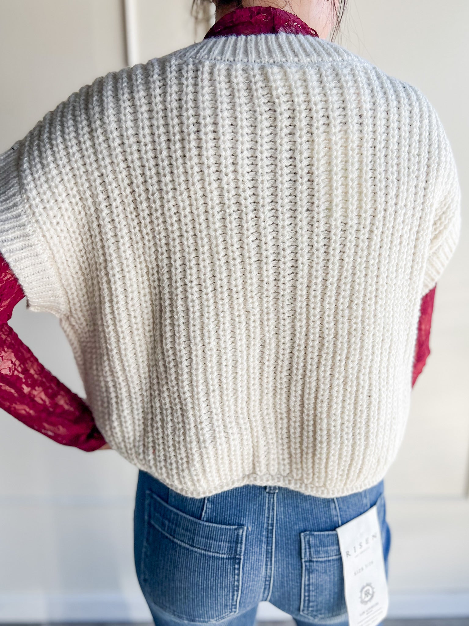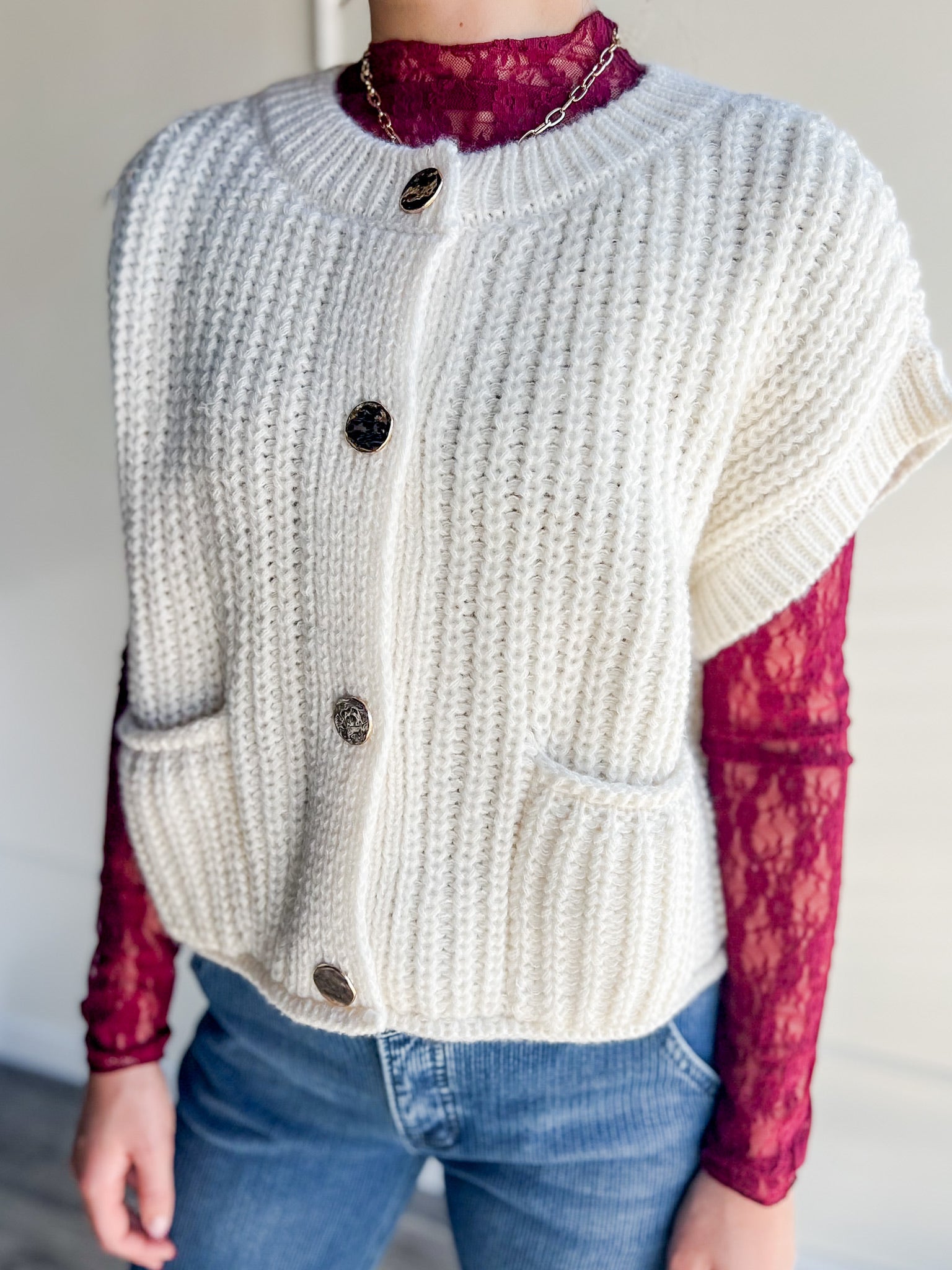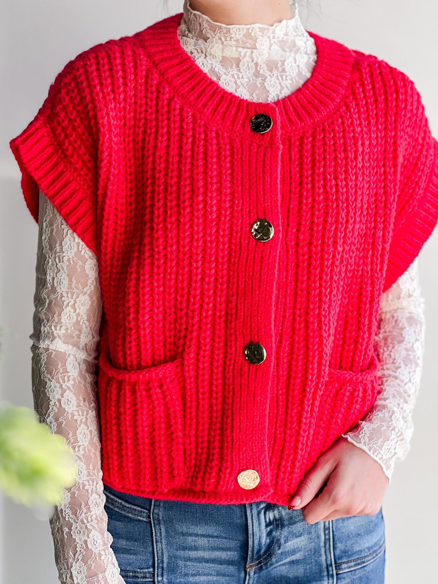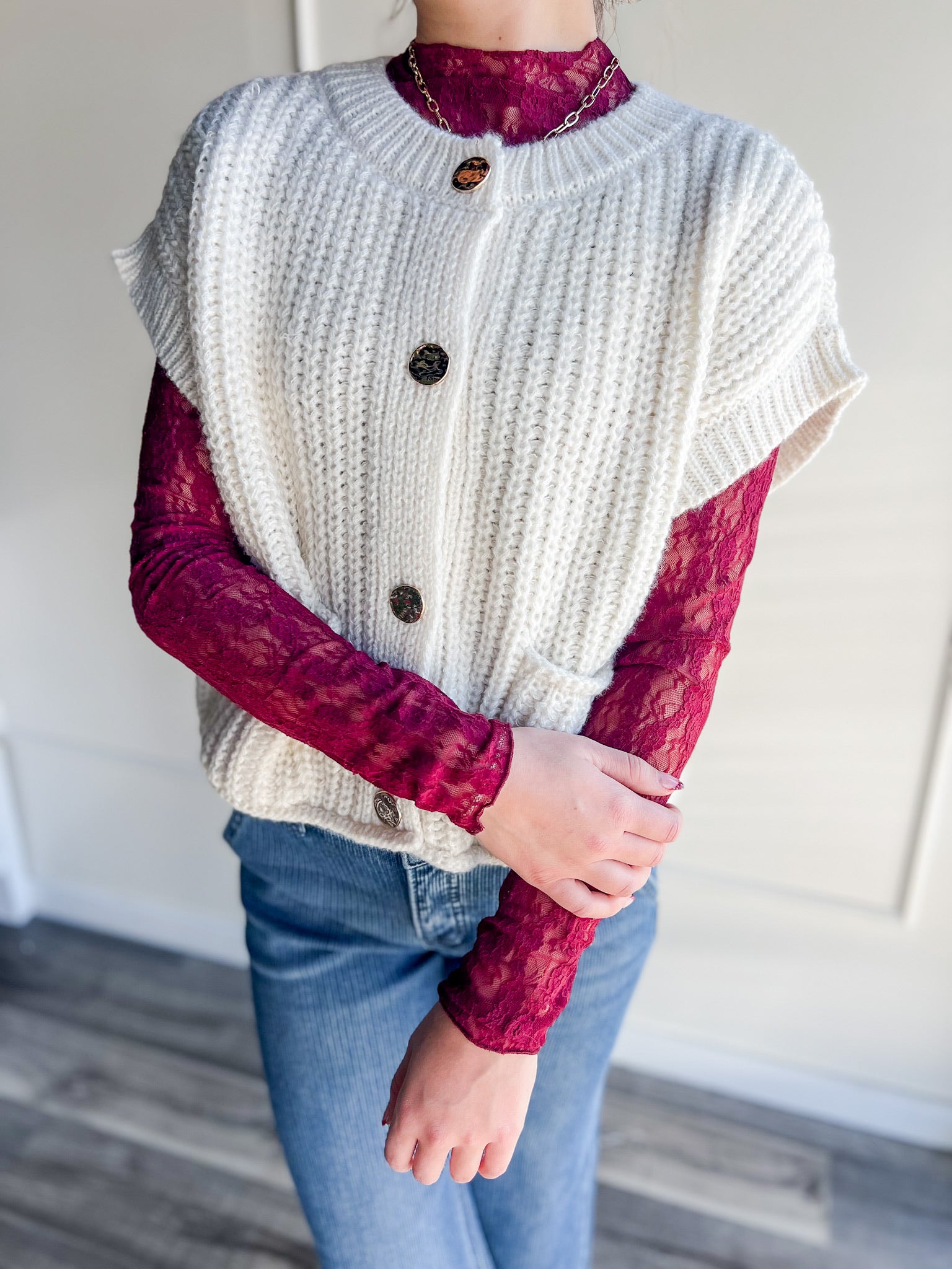 The Chunky Button Front Sweater Vest comes in black, red, and cream with bold gold hardware, deep pockets, and a soft ribbed knit that feels as good as it looks. Chloe is 5'7 wearing size small, pairing each color with lace undershirts for a festive, feminine touch — but it works just as beautifully over basics for everyday wear.