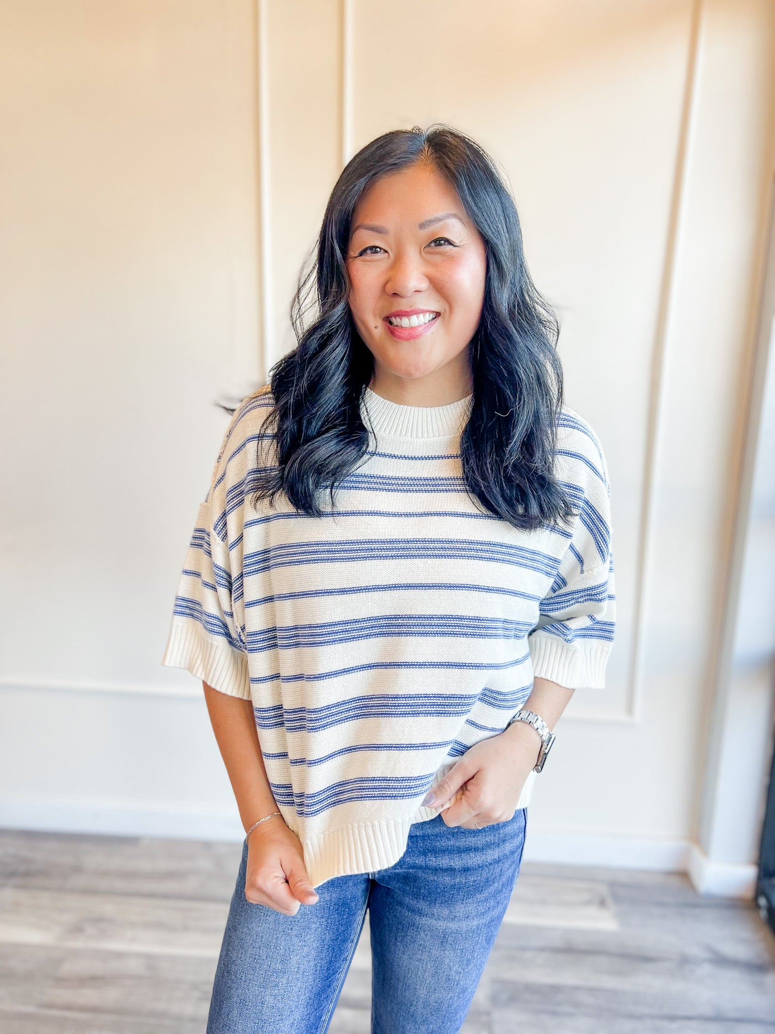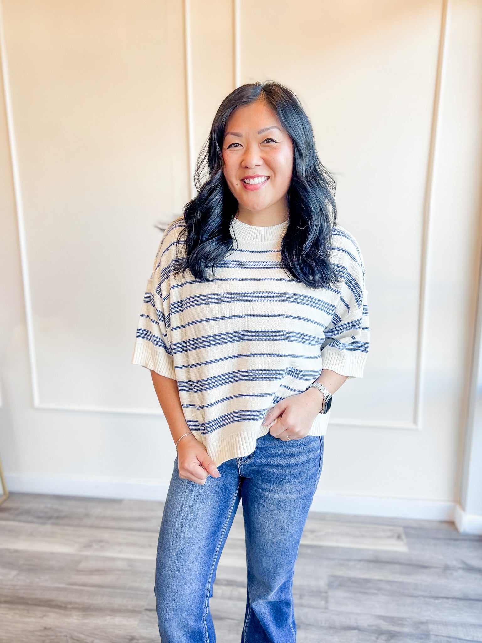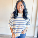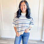 A breezy, easy striped knit with a relaxed drape and soft short sleeves — the perfect spring transition top. Lightweight, flattering and available in two fresh stripe combos: blue or green.
