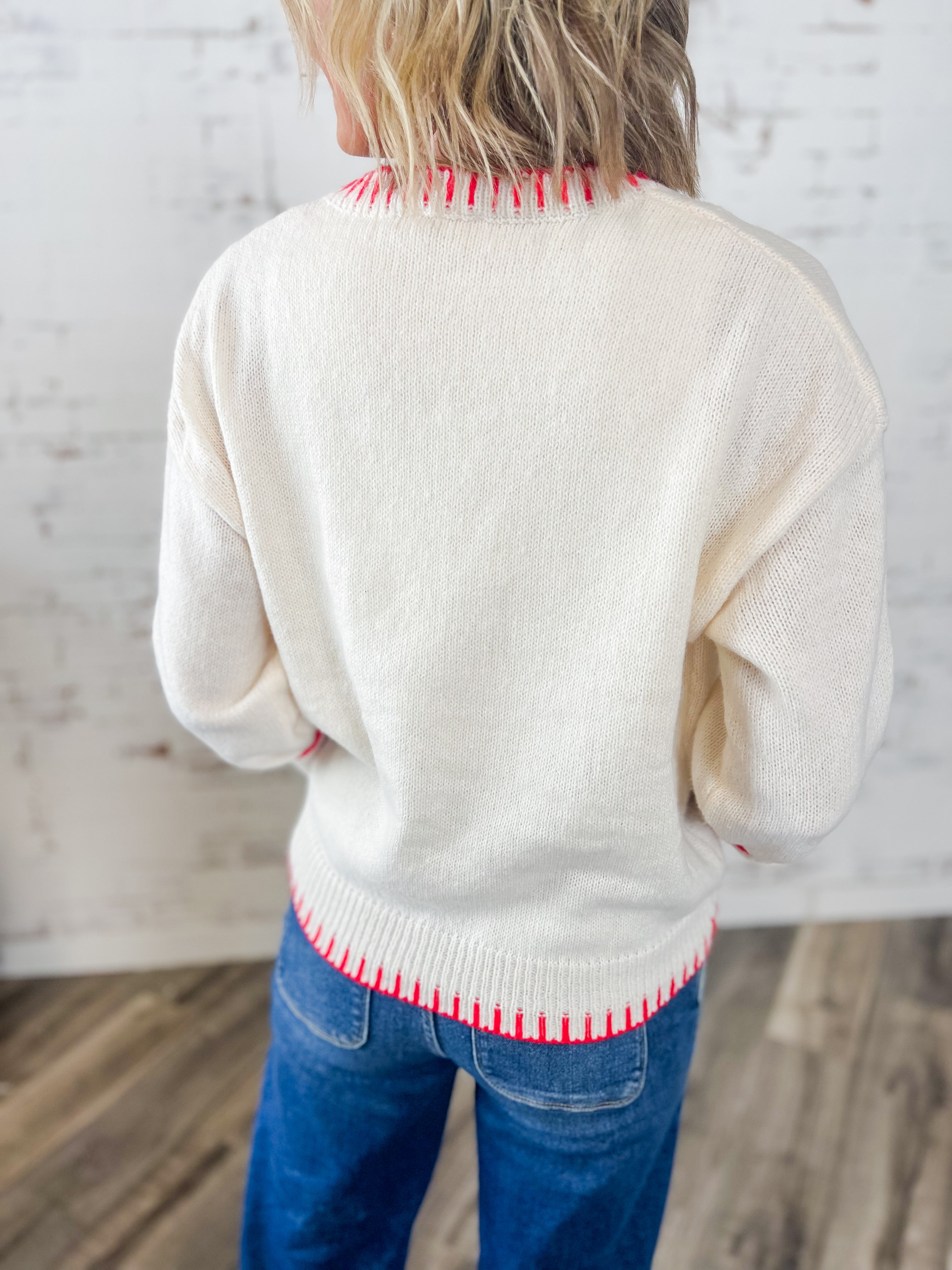 Get wrapped up in cozy-cute perfection with this darling ivory sweater featuring a bold red bow design that steals the show. The soft knit and relaxed fit make it the perfect blend of comfy and festive—just right for everything from cookie swaps to casual date nights. Pair it with denim, a skirt, or your favorite holiday jammies for that effortlessly styled look.
