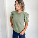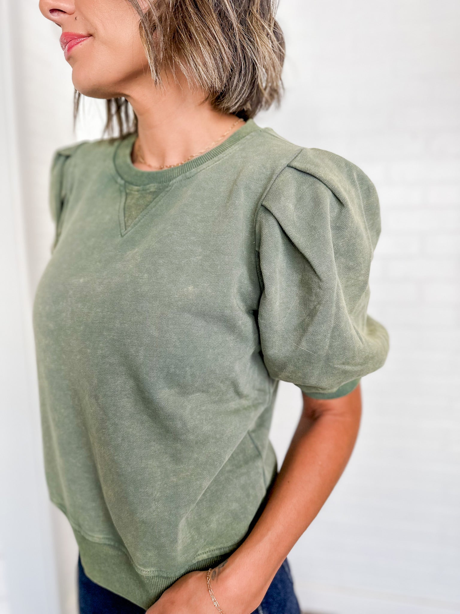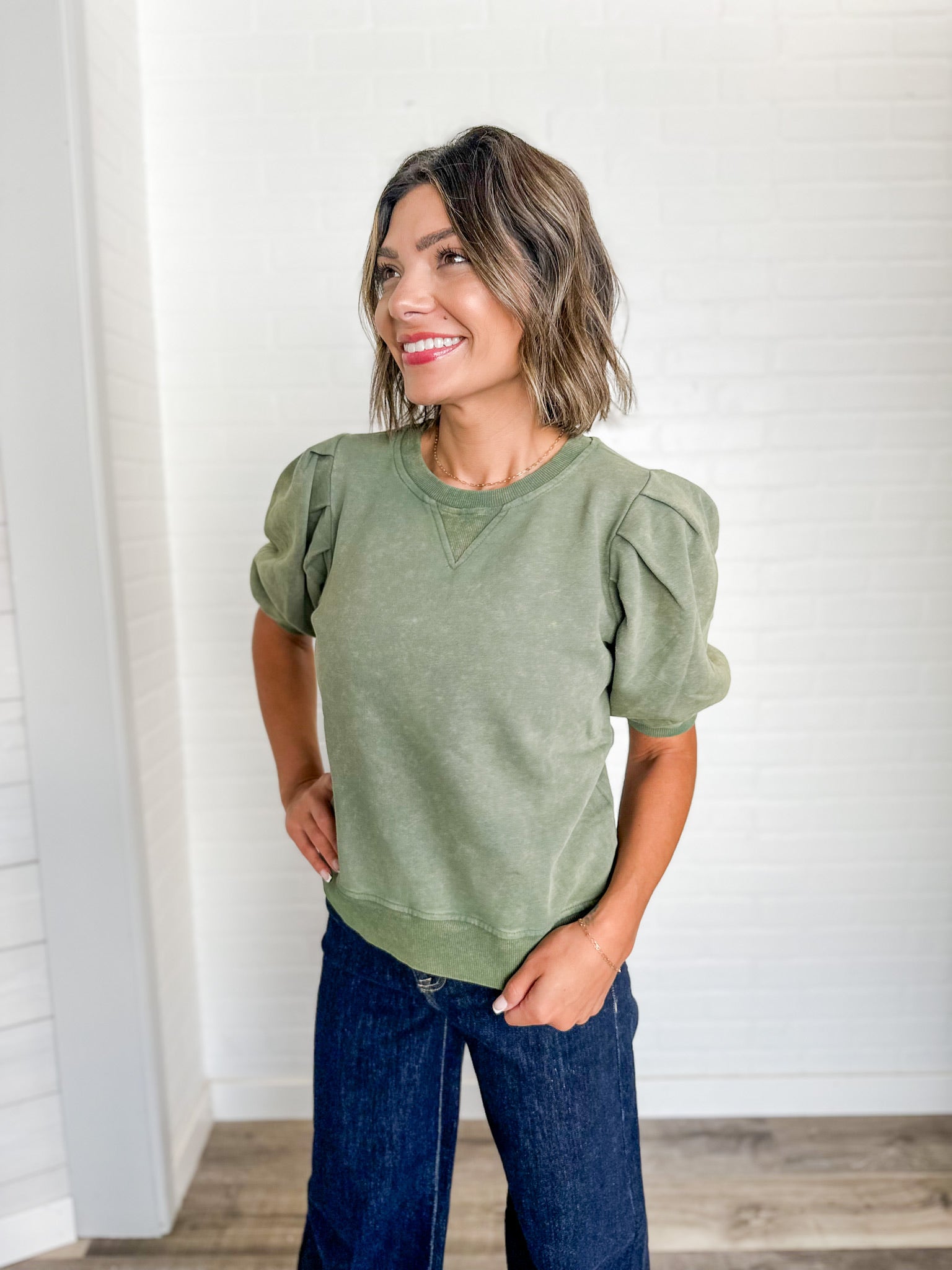 Sweet, simple, and just a little unexpected. This washed green puff-sleeve top brings a feminine twist to your favorite casual look. Soft fabric, subtle structure, and an easy fit make it the perfect pick for workdays or weekends. Rachel is 5’2” and wearing a size small.