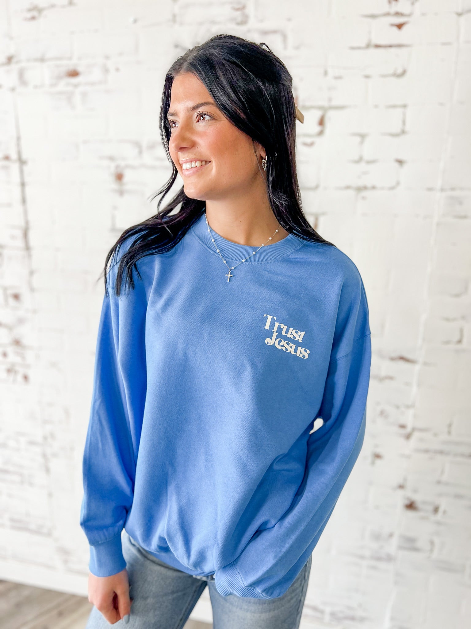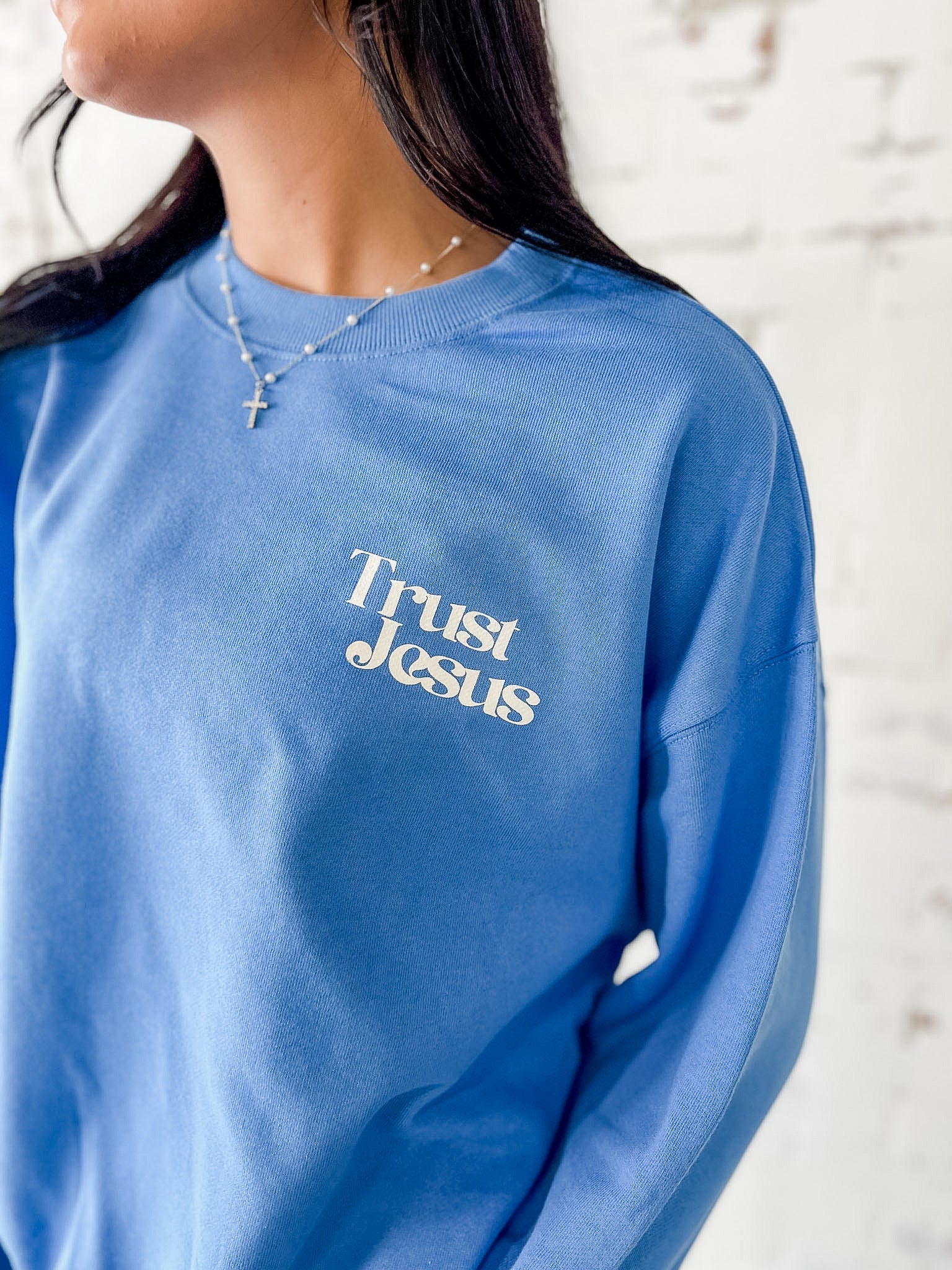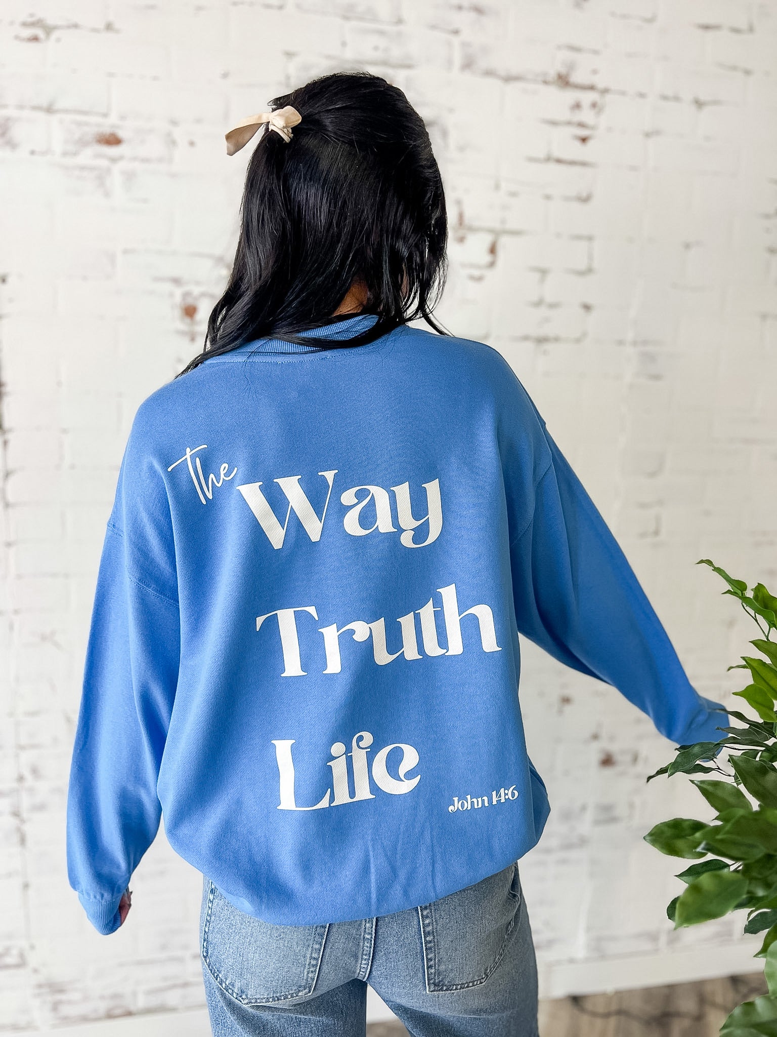 An everyday reminder wrapped in the comfort of your favorite sweatshirt. The Trust Jesus Way Truth Life Faith Graphic Sweatshirt features a simple “Trust Jesus” front graphic and a bold back design inspired by John 14:6 — “The Way, The Truth, The Life.” The oversized typography on the back makes the message powerful while keeping the look clean and modern.