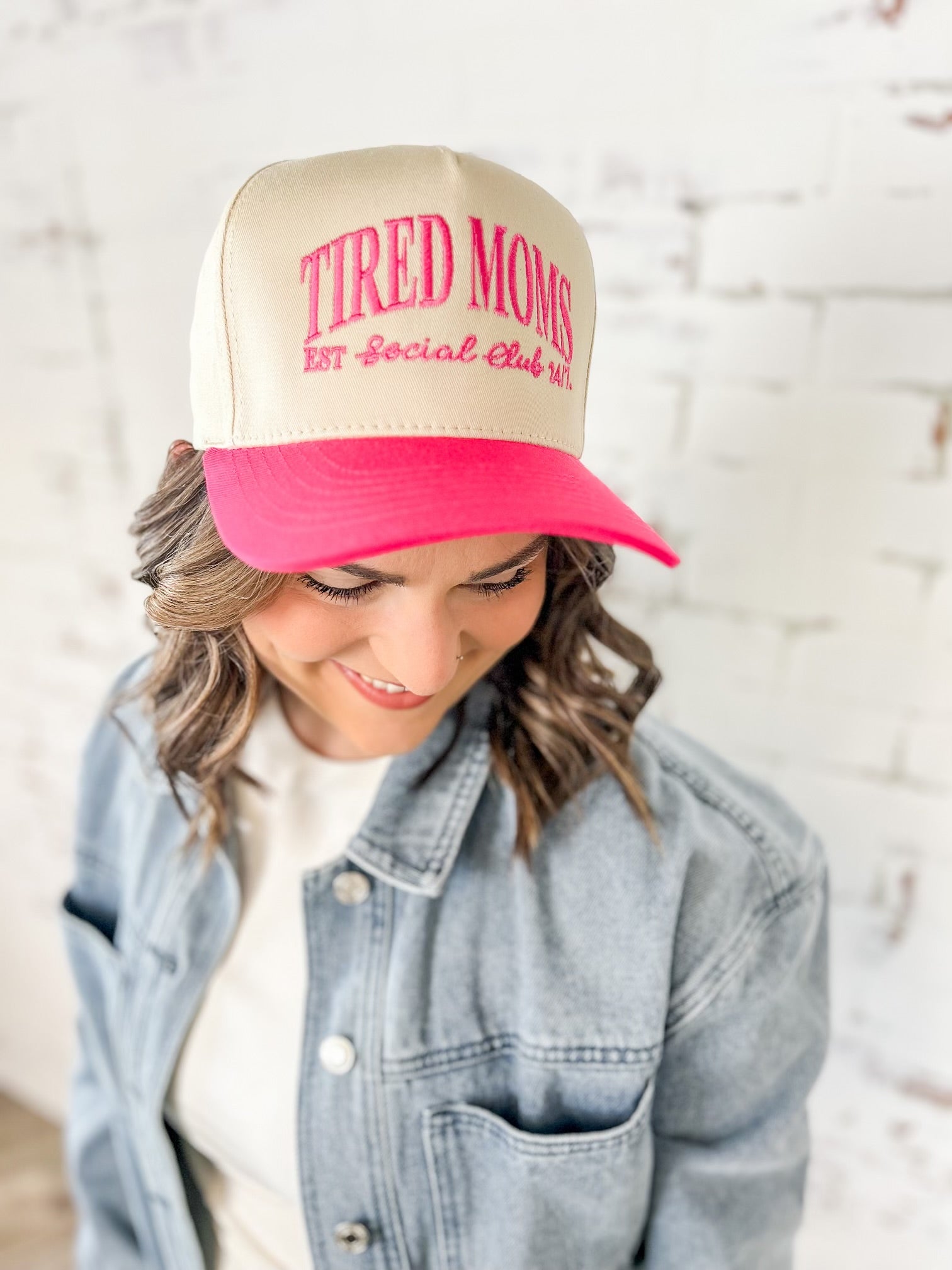 Add some style to your mom wardrobe (and hide those tired eyes) with our Tired Moms Trucker Hat. Join the social club of exhausted mothers in style with this trendy hot pink hat. No need to take yourself too seriously, mama.