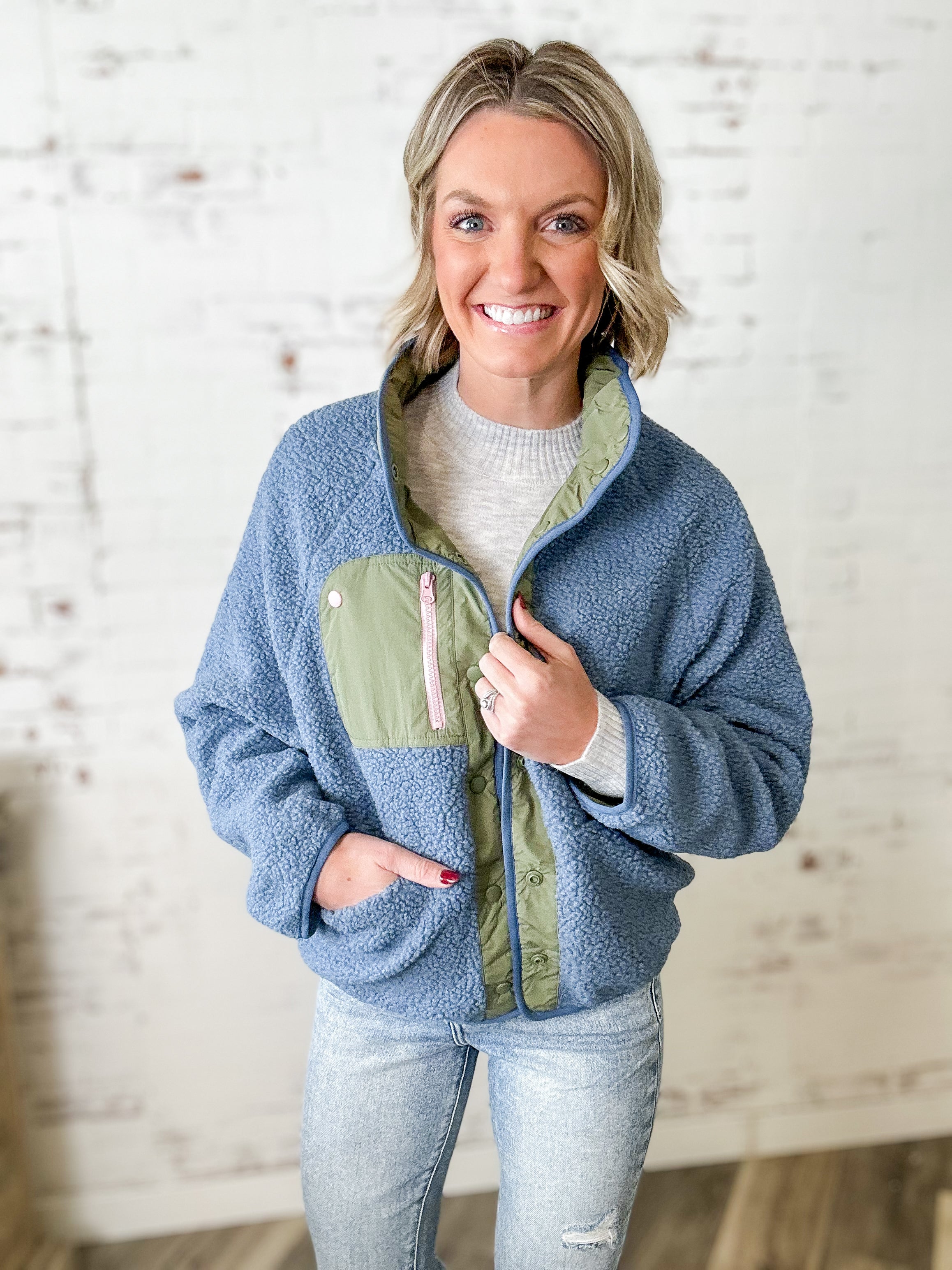 This soft, cozy sherpa jacket is the layer you’ll grab every time the temps dip and the calendar gets full. The plush fleece feel keeps you warm without the weight, and the contrast nylon trim adds that sporty-cute touch you can pair with leggings, denim, or your go-to joggers for school runs and Saturday errands.