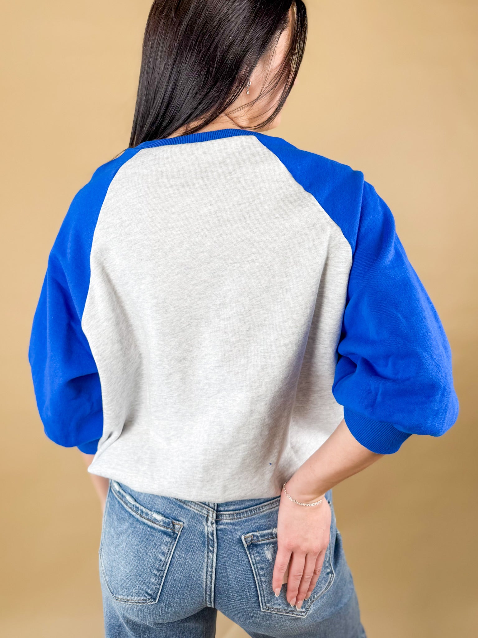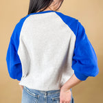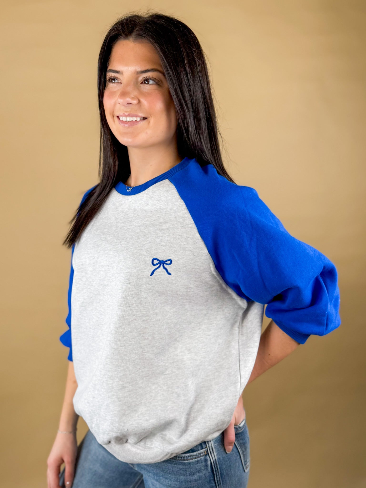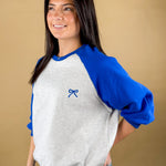 A casual classic with a feminine twist. This soft raglan top features bold blue sleeves and a dainty bow detail for a look that’s equal parts sporty and sweet. Easy, comfy and perfect for everyday wear.