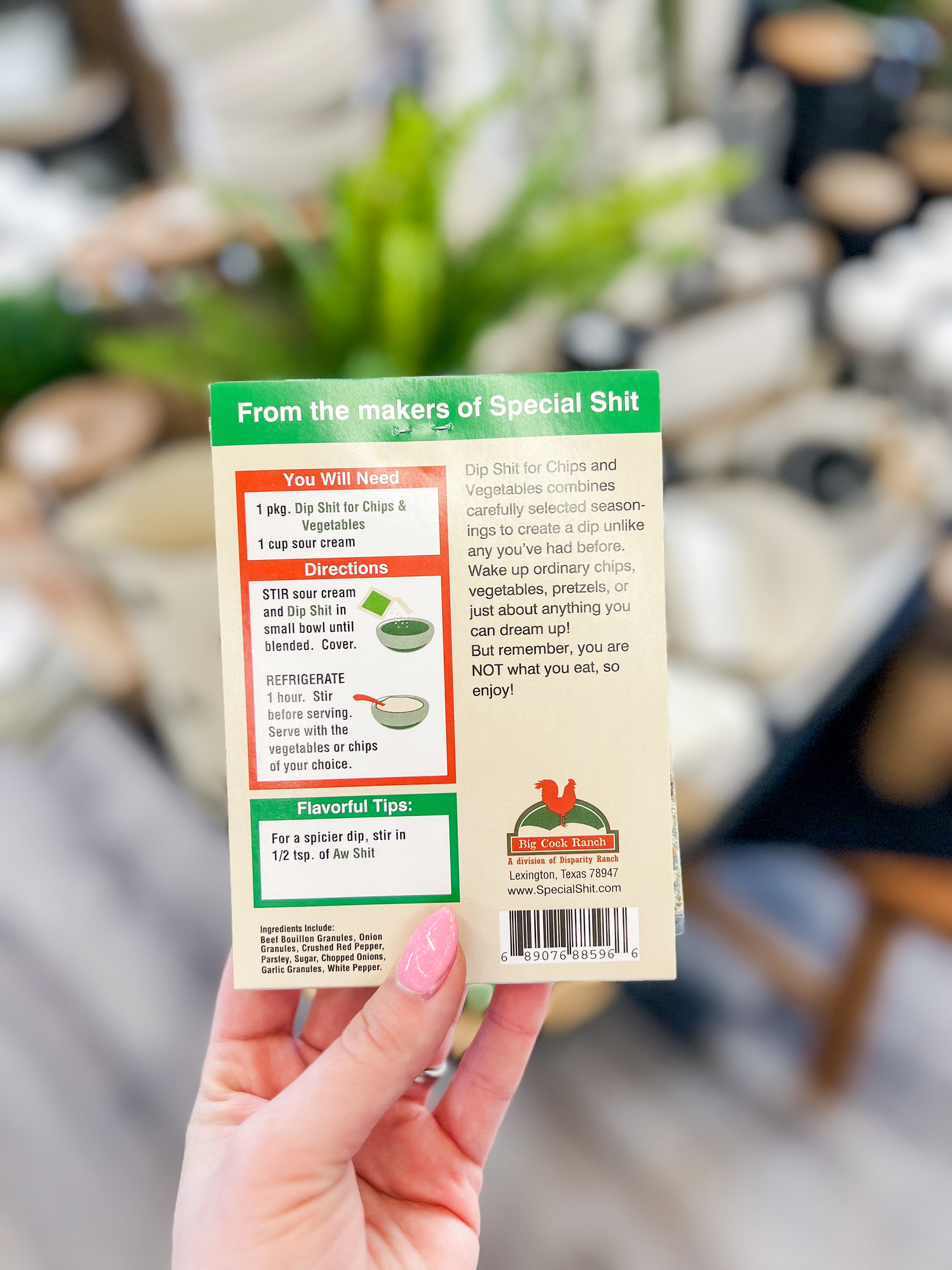 We have created a really unique taste in our Dip Shit for Vegetables (and Chips). Makes a welcome contribution to a party, or to just indulge yourself in private. With its slightly hot taste, you are subtlety encouraged to sip your adult beverage of choice slightly faster than normal. Mix the envelope with eight ounces of sour cream and allow to chill for an hour. Then dip your favorite veggies or chips, or even put it on a baked potato. No longer will you wince every time you hear Dip Shit, they’re not talking about you.
