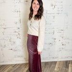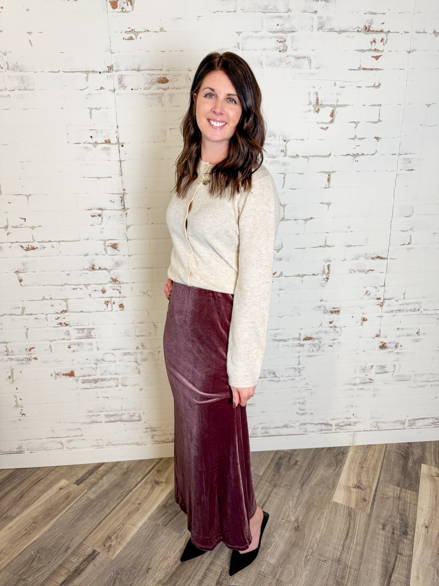 The Pull-On Velvet Maxi Skirt adds texture, warmth and a little drama to your winter wardrobe — without trying too hard.