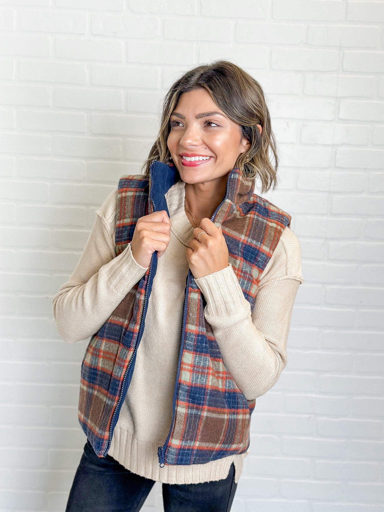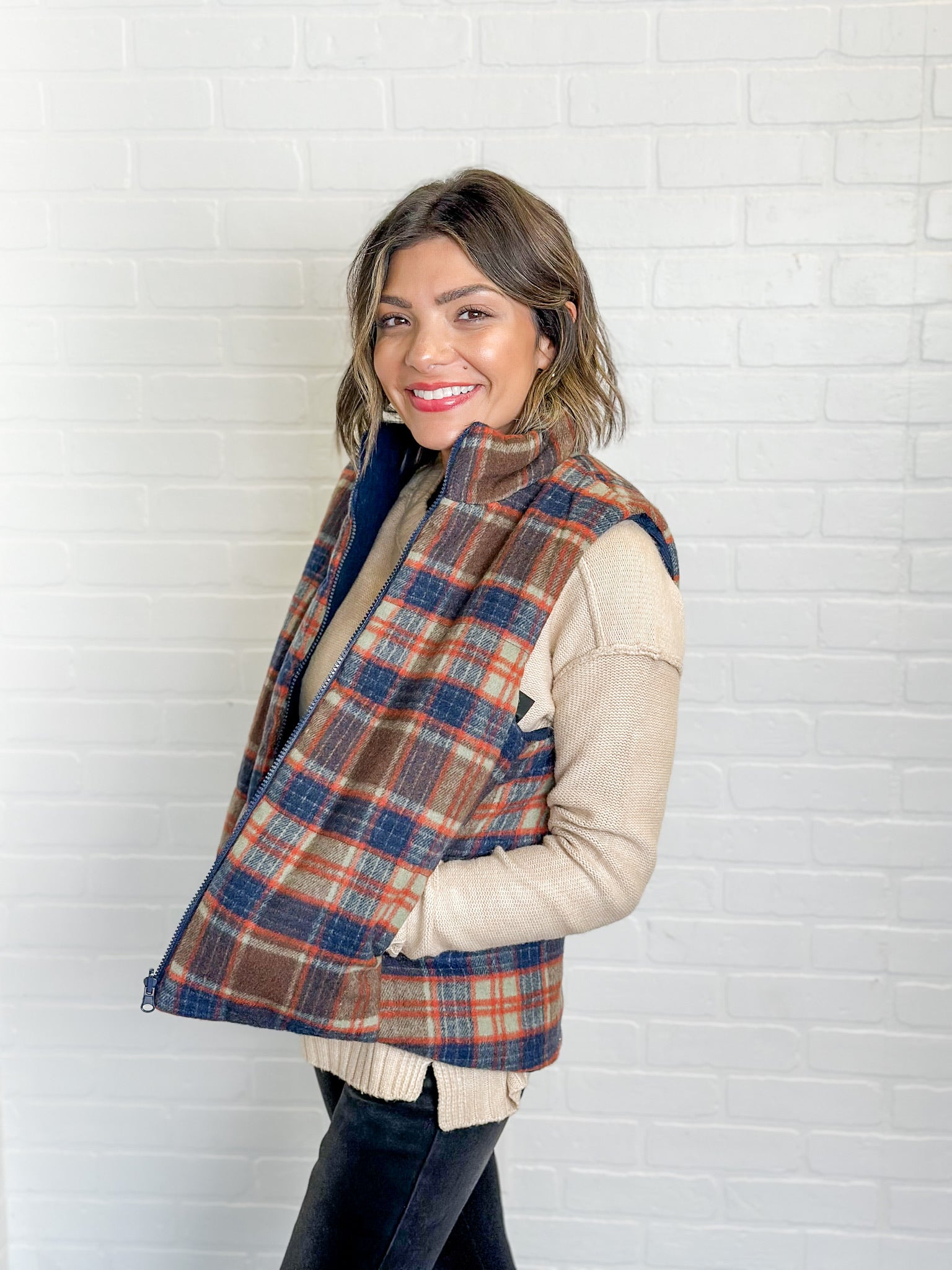 Fall layering at its finest. This cozy plaid vest brings a pop of seasonal color with rich navy, rust, and cream tones. Lightweight but warm, it’s perfect for layering over sweaters or flannels for that classic autumn look. Rachel is 5’2” and wearing a size small.