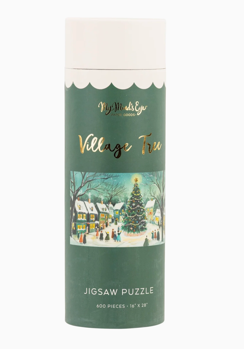 Celebrate the season with this Village Tree Puzzle! This festive 600-piece puzzle captures a charming holiday village scene centered around a glowing tree, perfect for cozy gatherings and joyful moments. Challenge yourself and friends as you piece together this delightful winter wonderland, making your holiday party even more memorable. * chipboard jigsaw puzzle * 600 pieces * finished puzzle size is 28" x 16"