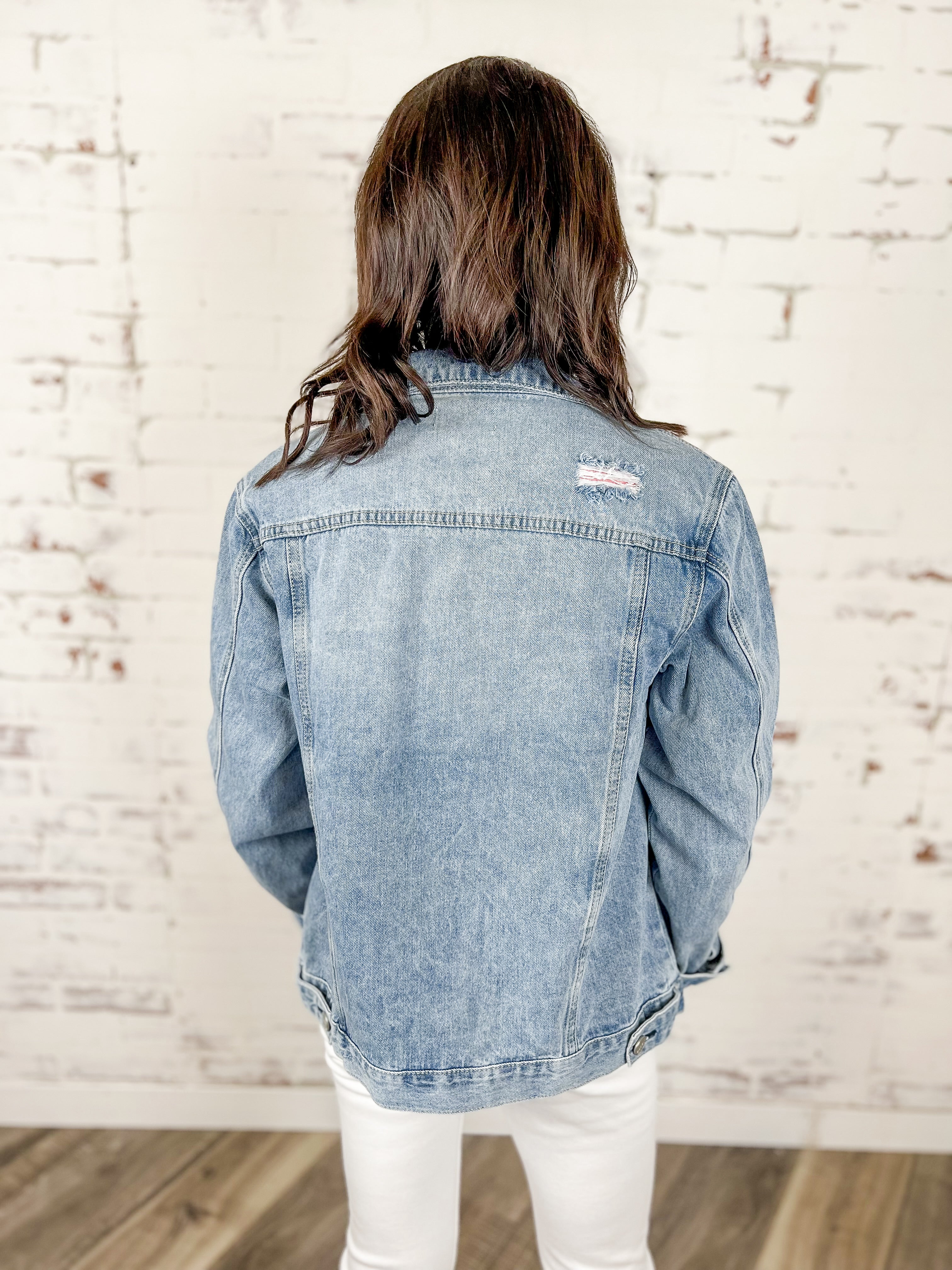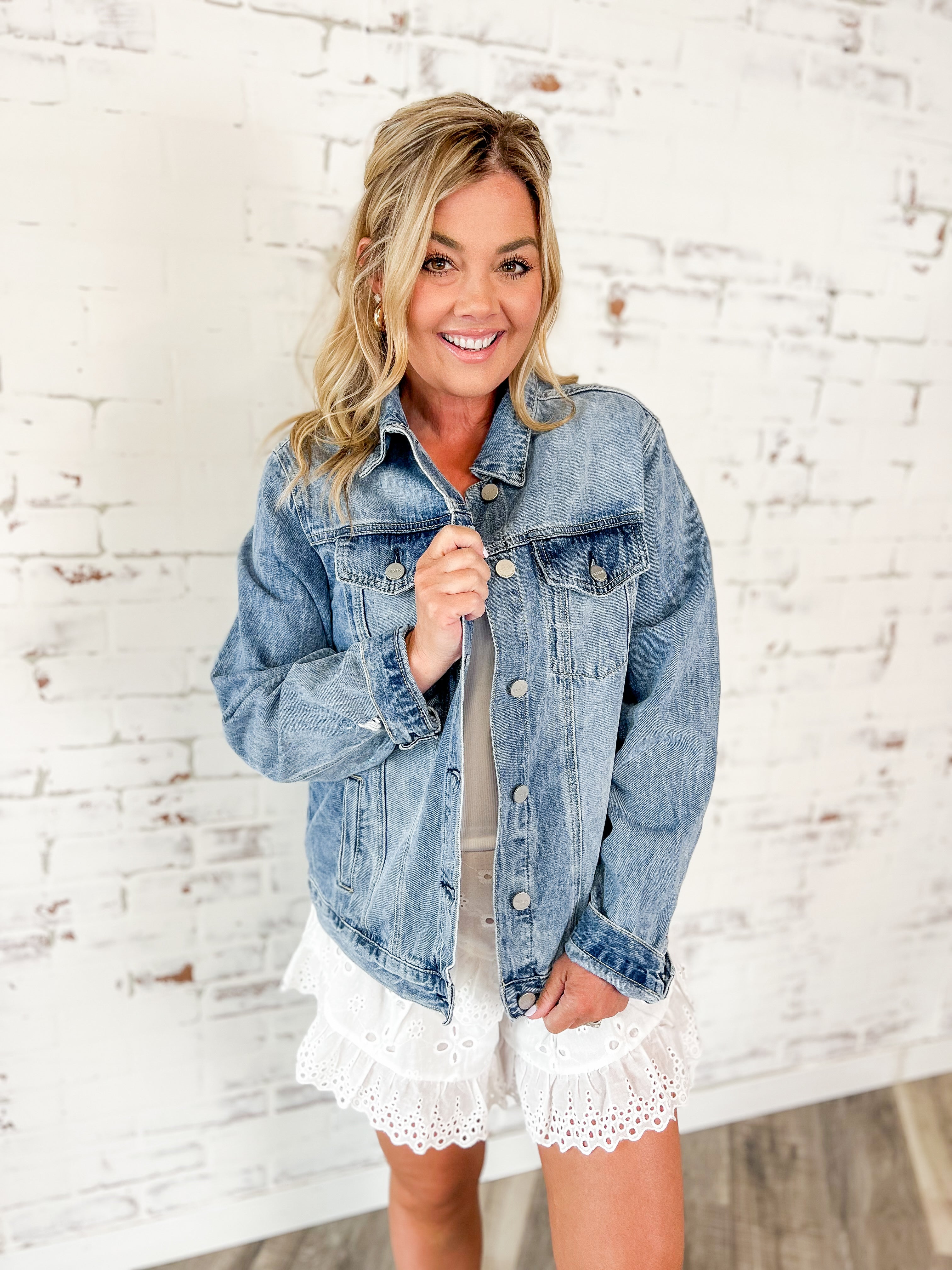 The layer that goes with everything. This classic denim jacket features a relaxed fit, vintage-inspired wash and just the right amount of structure. Toss it on over your favorite tanks, dresses or tees and you’re ready to roll. It’s the jacket you’ll grab for busy mornings, breezy nights and all those in-between moments.