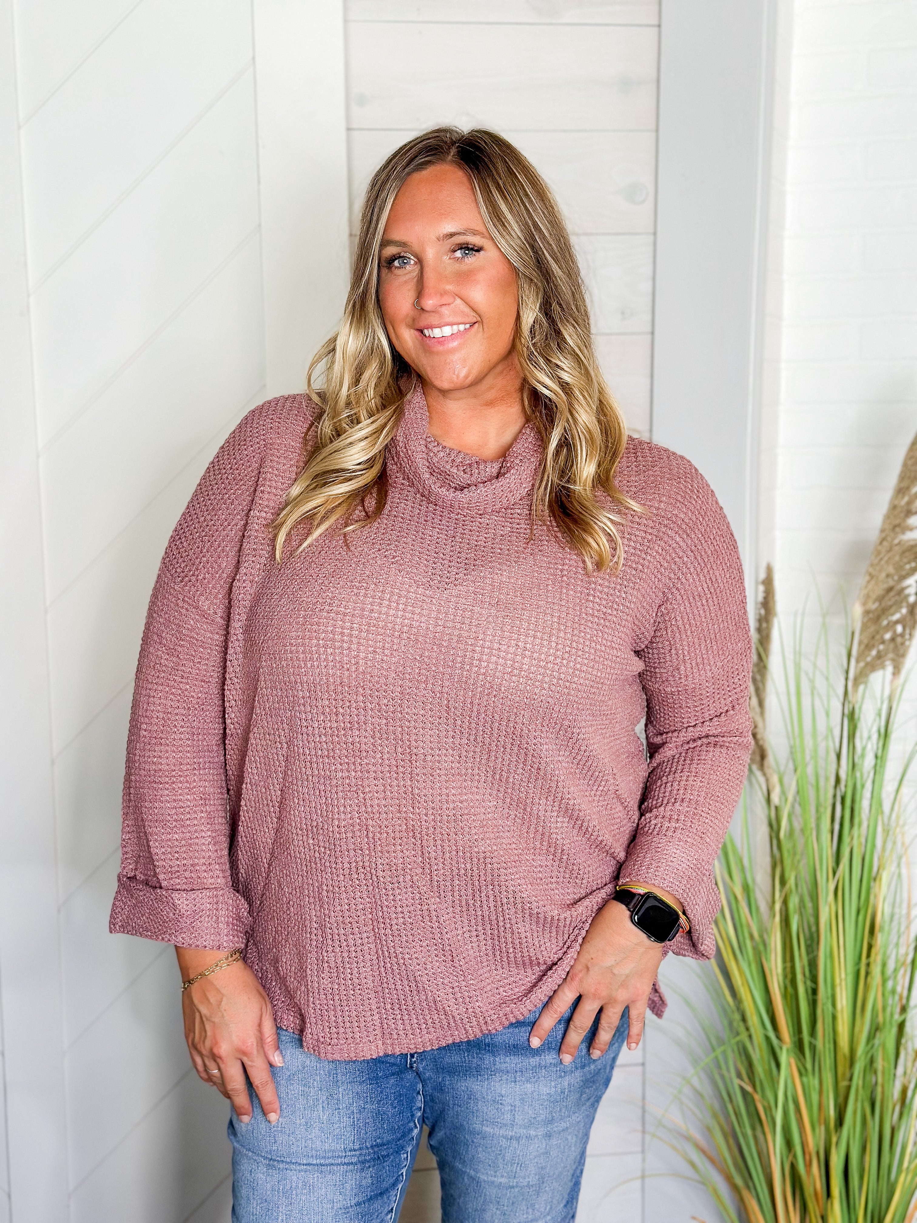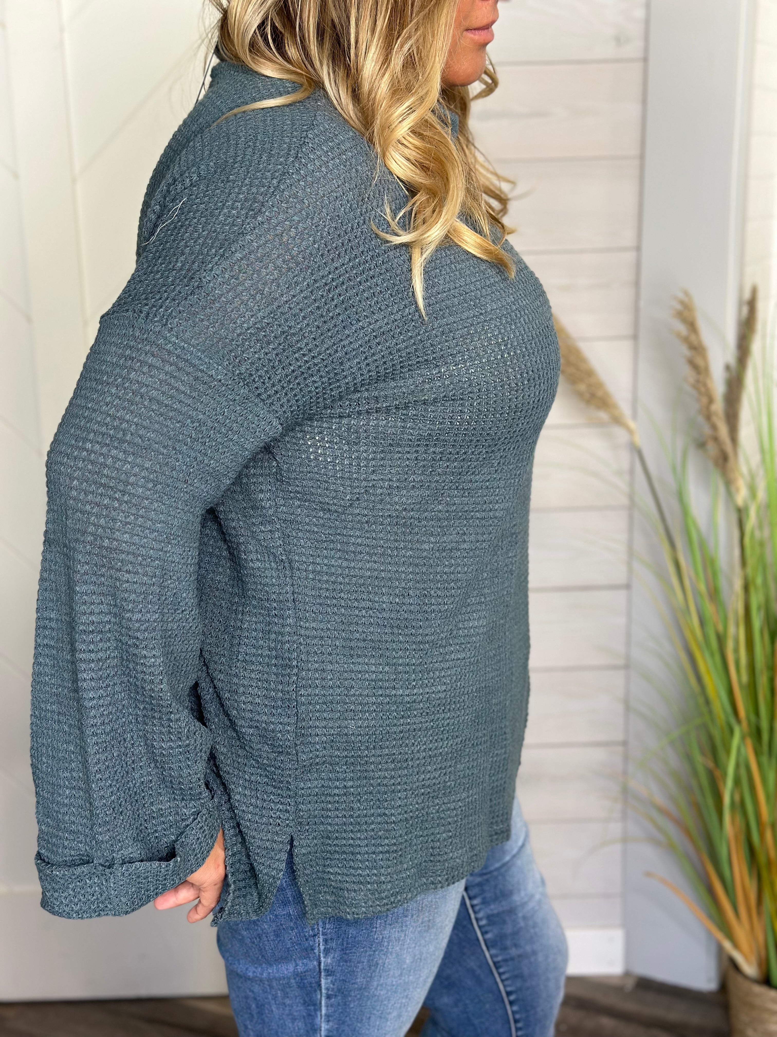 Lightweight and leggings-friendly, this waffle knit top is the perfect layering piece for fall! We love the cuffed sleeve and side slit details.