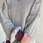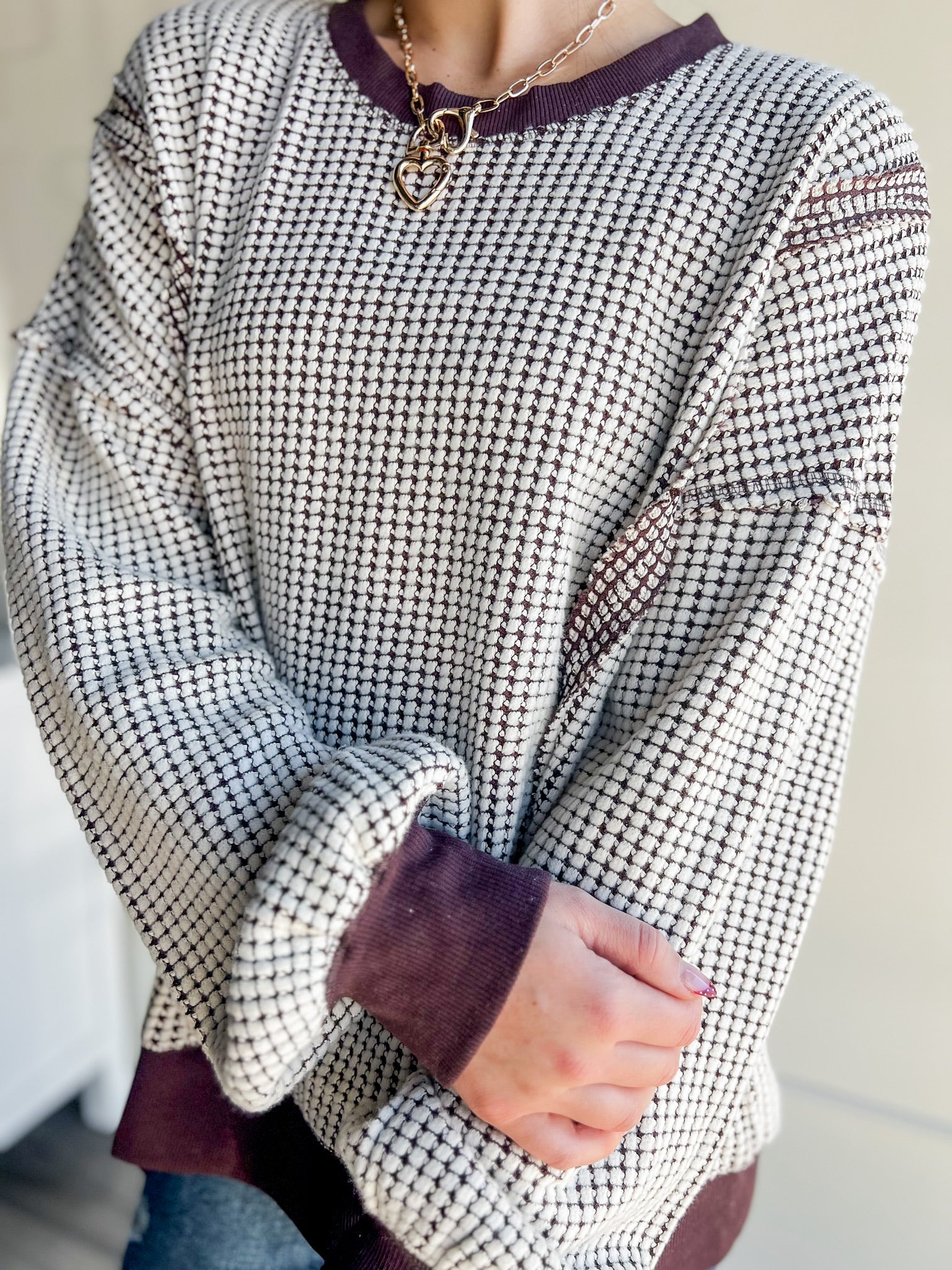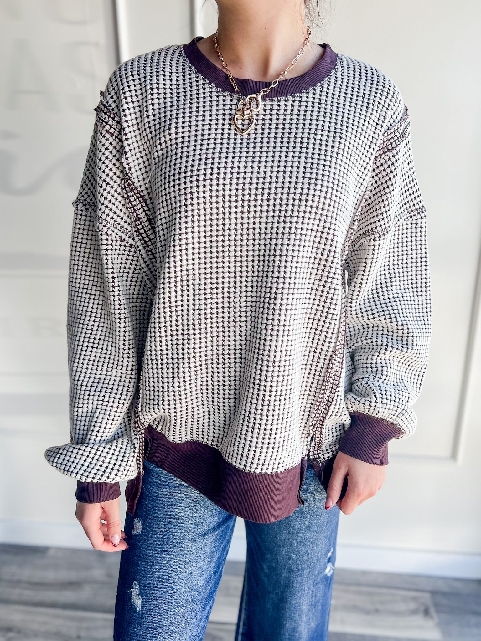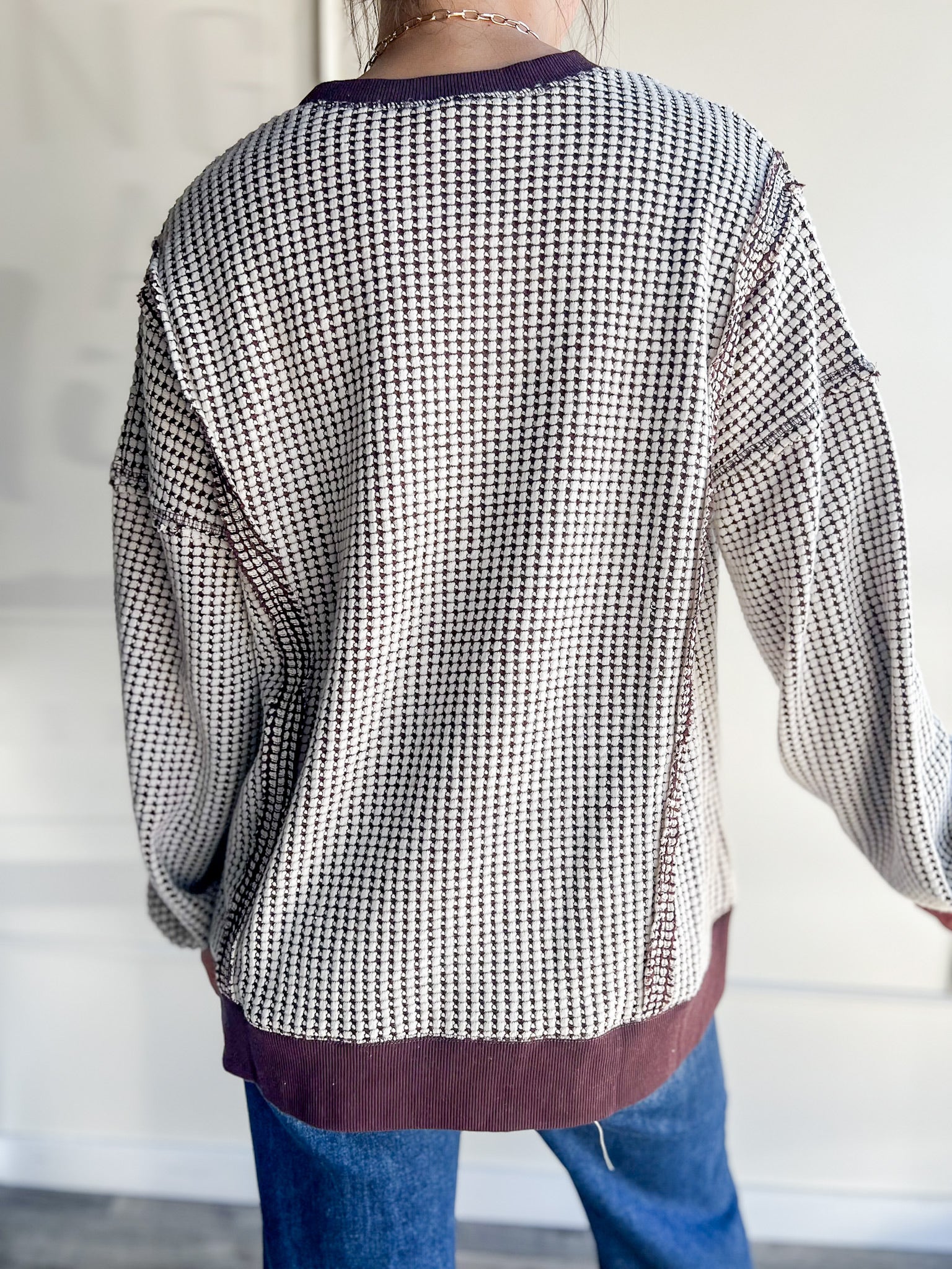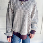 The Cozy Waffle Knit Contrast Pullover brings all the textured charm with contrast sleeves, rich brown trim, and an easy oversized fit that works for every busy mom on the move. Chloe is 5'7 wearing her true size small, showing how easy this top drapes without feeling bulky. Perfect for school runs, holiday errands, or curling up with cocoa on the couch.