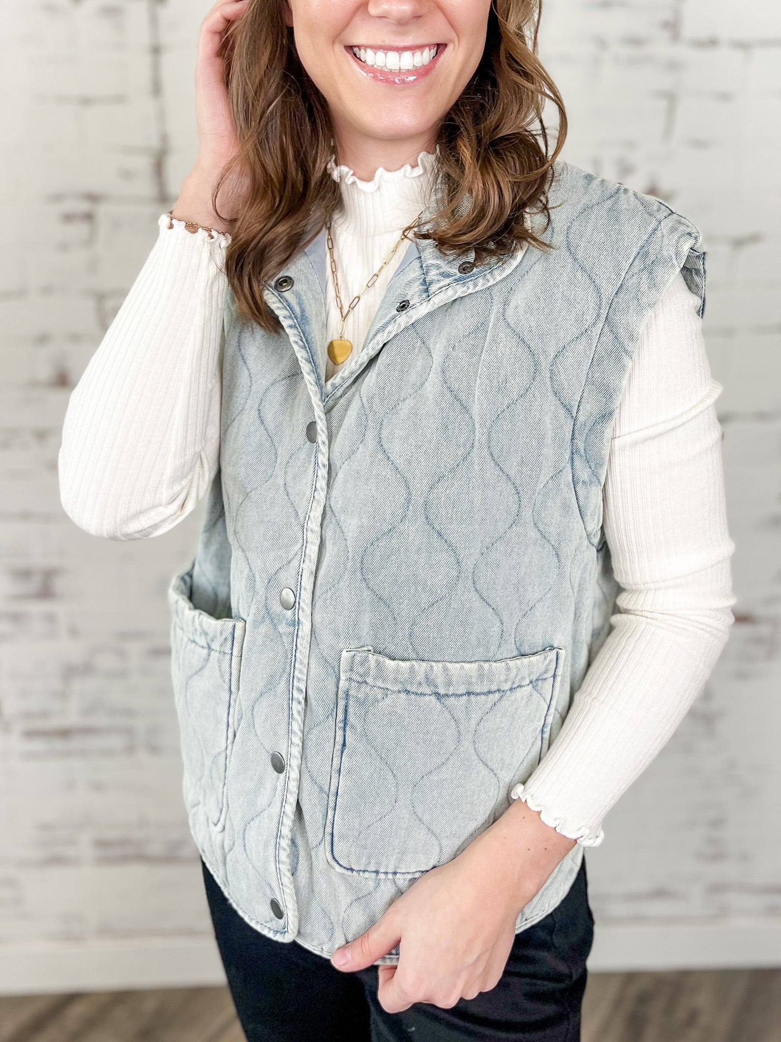 Meet The Wavy Wonder Quilted Denim Vest — the lightweight layer you’ll reach for every time you want to feel put together without trying too hard. This soft quilted denim gives that lived-in look we all love while adding just the right amount of cozy for school runs, errand days or laid-back weekends. Kendra’s rocking it with a ribbed long sleeve and it’s as cute as it is effortless.