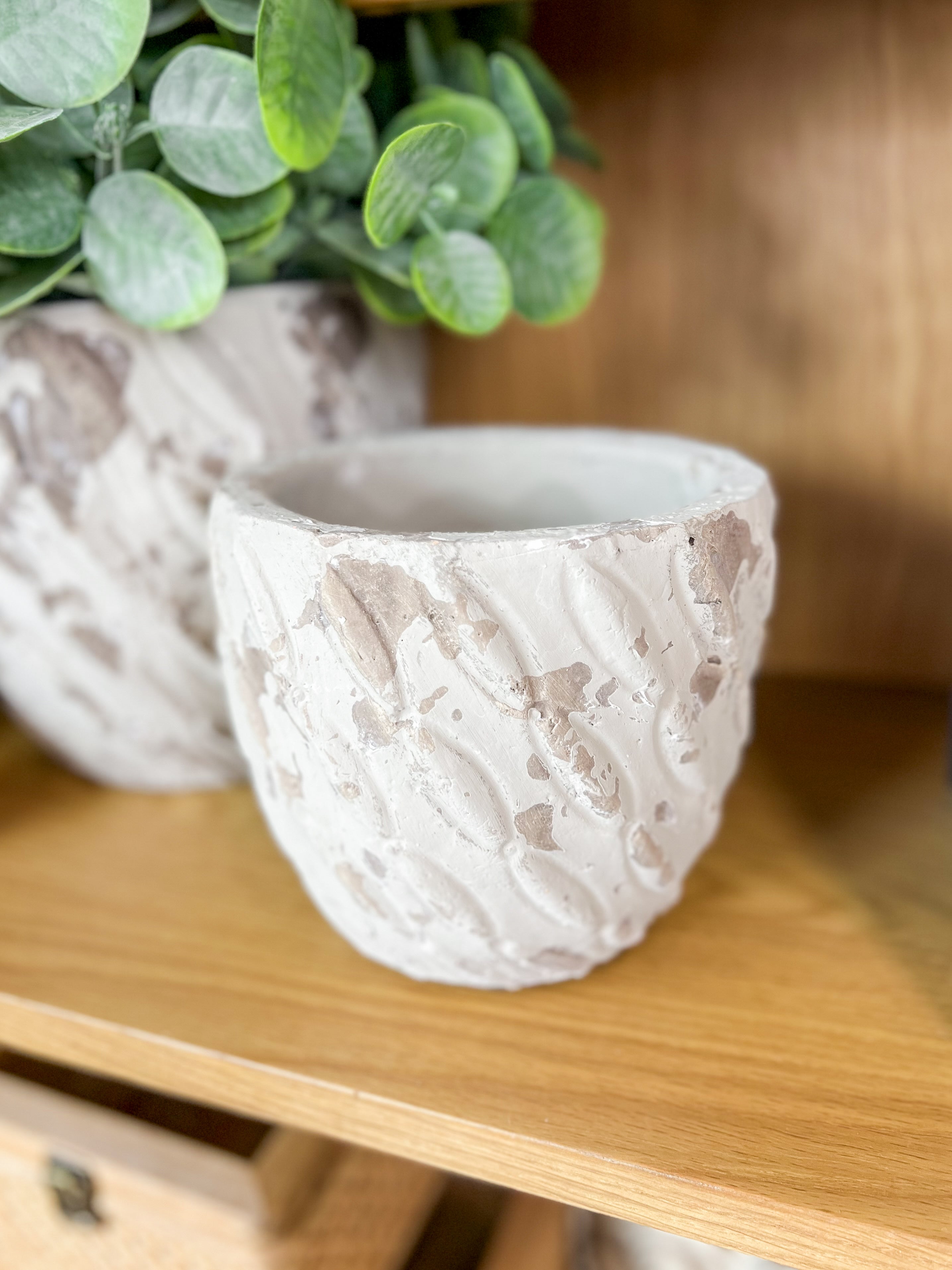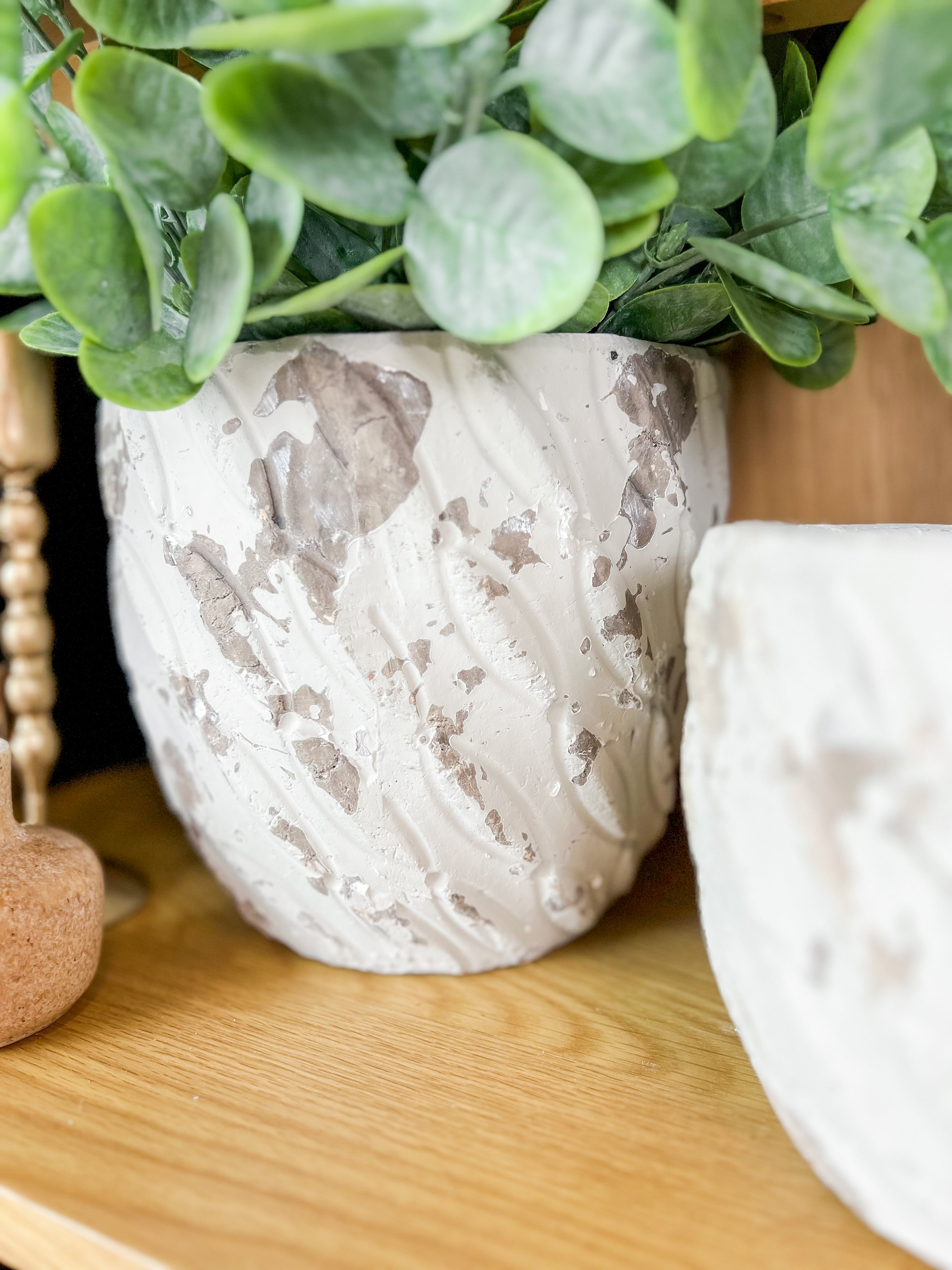 Large whitewashed planter with taupe texture