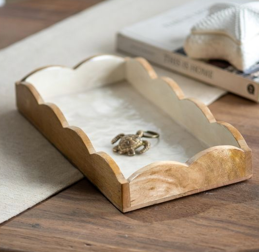 A little detail goes a long way. This 13 x 6" wood tray features a soft scalloped edge and natural finish that brings warmth and character to coffee tables, dressers and entry consoles. Style it with candles, beads or everyday essentials for a layered, collected look.