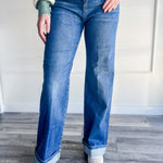 Dark wash with wide leg and cuffed hem