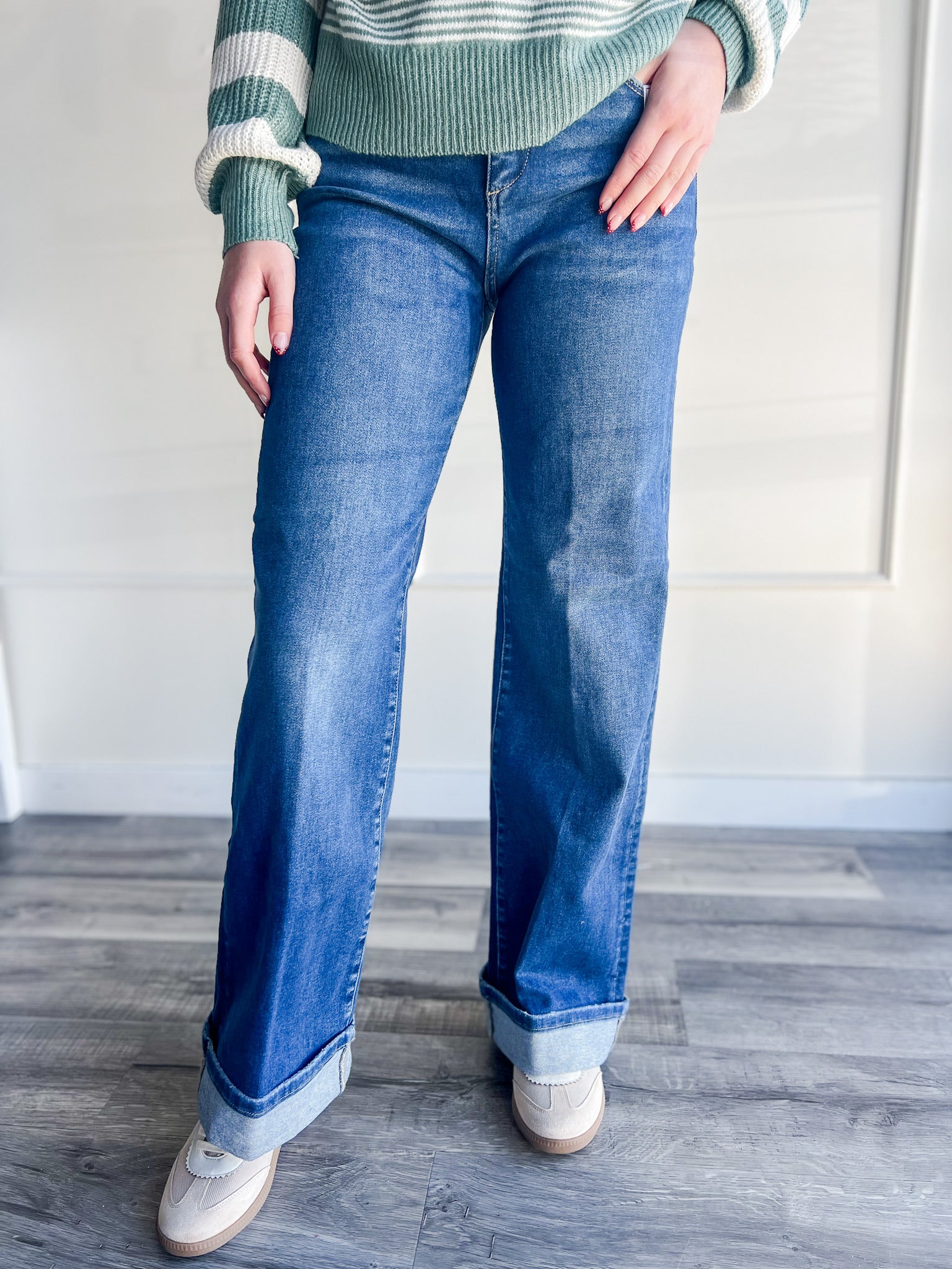 These jeans are giving weekend ease meets everyday polish. The Risen Wide Leg Cuffed Jeans feature a dark wash and flattering high-rise fit designed to smooth and elongate. With built-in tummy control and a soft stretch feel, they’re made for the woman who wants comfort without compromising style. Perfect for pairing with your favorite sweaters, graphics, or dressy blouses — these jeans do it all.