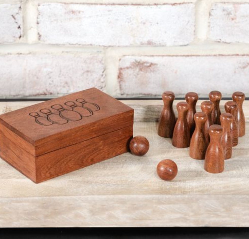 Strike some fun with this wooden tabletop bowling set! Tucked neatly in a box engraved with bowling pins, this compact game is perfect for desks, coffee tables, or gifting to the game-lover in your life. Who knew knocking down pins could look so chic?