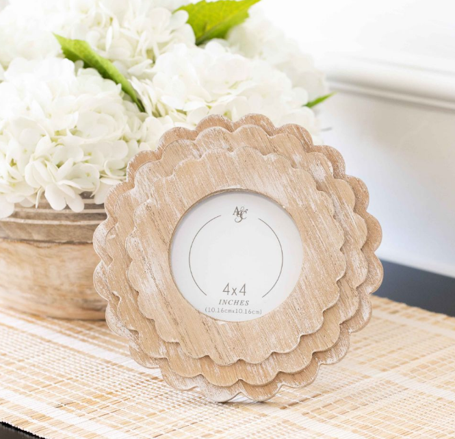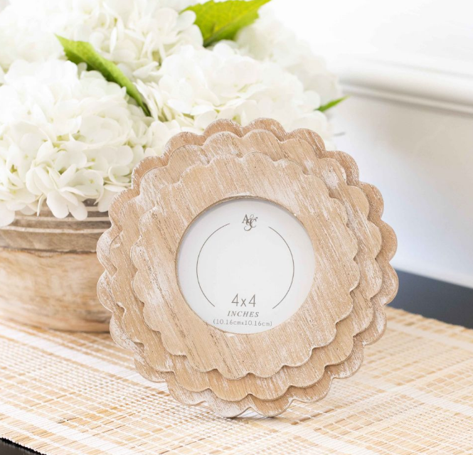 Measuring 8x8x1 inches, this beautifully crafted frame features a delicate scallop design and a natural wood finish, perfectly sized to showcase a 4x4 photo. The elegant scalloped edges add a touch of rustic sophistication to any room, making it a delightful addition to your home décor or a thoughtful gift for loved ones.